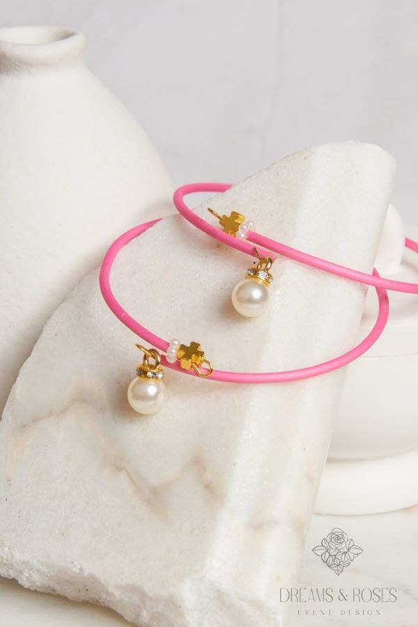 Για μια πιο παιχνιδιάρικη και σύγχρονη εμφάνιση, επιλέξτε τα μαρτυρικά βάπτισης G-40. Κατασκευασμένα από ανθεκτικό ροζ καουτσούκ, διακοσμούνται με μια κρεμαστή πέρλα που φέρει στρας και έναν μικρό μεταλλικό χρυσό σταυρό. Μια πρωτότυπη πρόταση που συνδυάζει την παράδοση με τα μοντέρνα υλικά.