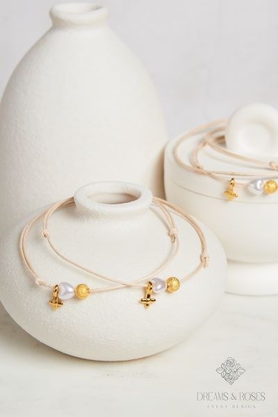 Τα μαρτυρικά βάπτισης G-41 αποπνέουν τρυφερότητα. Το εκρού κερωμένο κορδόνι στολίζεται με μια πέρλα σε σχήμα καρδιάς, μια χρυσή glitter χάντρα και έναν διακριτικό επίχρυσο σταυρό 24Κ. Είναι η ιδανική επιλογή για τη βάπτιση ενός κοριτσιού, προσφέροντας μια αίσθηση ρομαντισμού και πολυτέλειας.