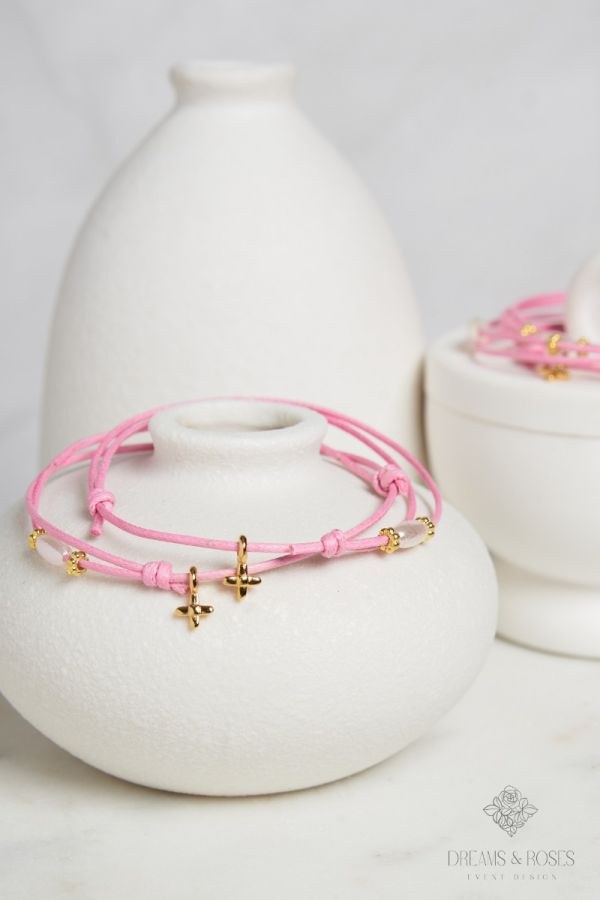 Η πολυτέλεια του χρυσού 24Κ συναντά το φωτεινό ροζ στα μαρτυρικά βάπτισης G-49. Το κερωμένο κορδόνι φιλοξενεί έναν λεπτό επίχρυσο σταυρό και μια οβάλ πέρλα που πλαισιώνεται από χρυσές ροδέλες. Ένα διακριτικό αλλά πολύτιμο δώρο για τους καλεσμένους σας.