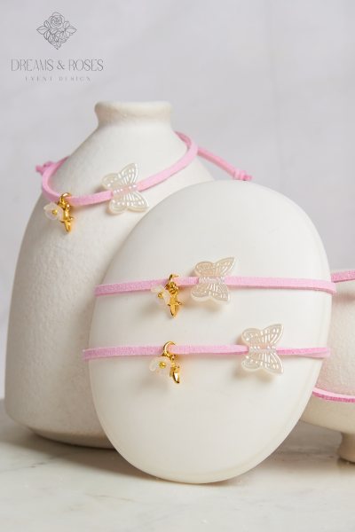 Ονειρικά μαρτυρικά βάπτισης G-50 που θυμίζουν ανοιξιάτικο κήπο. Το λιλά suede κορδόνι στολίζεται με μια εντυπωσιακή ακρυλική πεταλούδα, έναν επίχρυσο σταυρό 24Κ και ένα μικρό λευκό λουλουδάκι. Μια παραμυθένια επιλογή για τη βάπτιση της μικρής σας πρωταγωνίστριας.