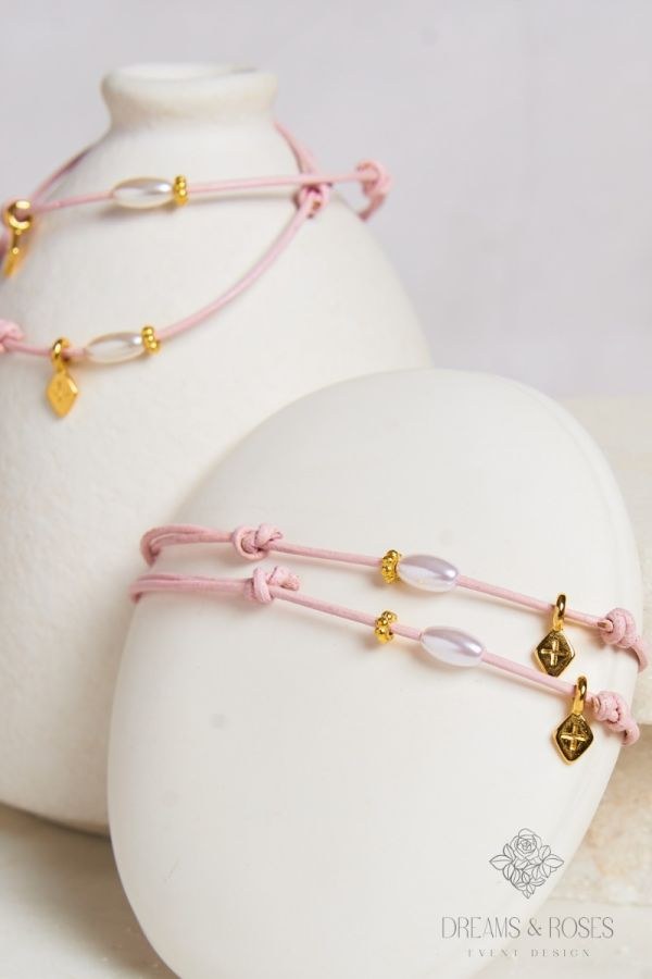 Η διαχρονική γοητεία του δέρματος στα μαρτυρικά βάπτισης G-55. Το απαλό ροζ δερμάτινο κορδόνι φιλοξενεί μια οβάλ πέρλα ανάμεσα σε χρυσές ροδέλες και έναν κομψό επίχρυσο σταυρό 24Κ σε σχήμα ρόμβου. Μια luxury επιλογή για όσους αναζητούν την τελειότητα στη λεπτομέρεια.