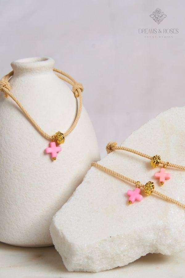 Minimal και ταυτόχρονα εντυπωσιακά, τα μαρτυρικά βάπτισης G-59 διαθέτουν εκρού πλεκτό κορδόνι και έναν τρισδιάστατο ακρυλικό σταυρό σε έντονο ροζ χρώμα. Το χρυσό μεταλλικό στοιχείο προσθέτει την απαραίτητη λάμψη, δημιουργώντας ένα μοντέρνο ενθύμιο για τη μεγάλη μέρα. * Η τιμή αφορά 50 τεμ.
