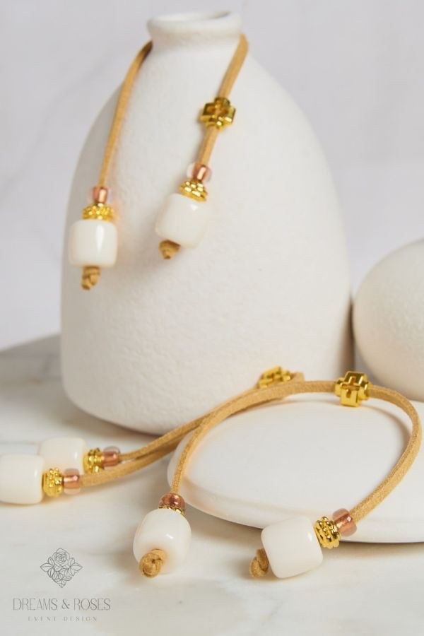 Ιδιαίτερα μαρτυρικά βάπτισης G-60 σε στυλ κομπολογιού, που συνδυάζουν τη διαχρονική γοητεία του μπεζ suede κορδονιού με μεγάλες ακρυλικές χάντρες σε λευκή απόχρωση. Διακοσμούνται με χρυσά μεταλλικά στοιχεία και έναν κομψό σταυρό, προσφέροντας ένα ξεχωριστό αναμνηστικό με ethnic-chic διάθεση.