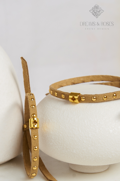 Για μια βάπτιση σε γήινους τόνους, τα μαρτυρικά βάπτισης G-63 σε λαδί κορδόνι είναι η ιδανική πρόταση. Το κορδόνι διακοσμείται με χρυσές μεταλλικές πινελιές (studs) κατά μήκος του και έναν κυλινδρικό μεταλλικό σταυρό στο κέντρο, δημιουργώντας ένα δυναμικό και μοντέρνο στυλ.