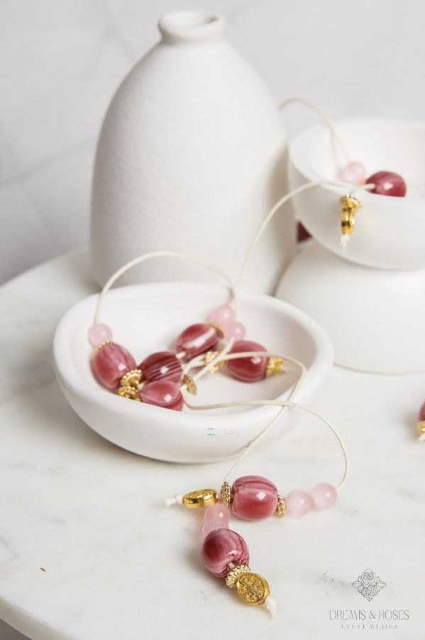 Για μια βάπτιση με vintage αισθητική, επιλέξτε μαρτυρικά βάπτισης σε στυλ κομπολογιού. Με εκρού κορδόνι και μεγάλες ακρυλικές χάντρες στην αριστοκρατική απόχρωση του σάπιου μήλου, το συγκεκριμένο σχέδιο ολοκληρώνεται με ένα επίχρυσο Κωνσταντινάτο φλουρί. Ένα διαχρονικό ενθύμιο-φυλαχτό που συνδυάζει την παράδοση με τη ρομαντική διάθεση.
