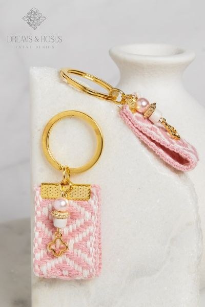 Χειροποίητα μαρτυρικά βάπτισης G-73 σε μορφή μπρελόκ με εντυπωσιακή υφαντή τρέσα σε ροζ-λευκό pattern. Το σύνολο ολοκληρώνεται με μια ροζ πέρλα, χρυσές ροδέλες και έναν περίτεχνο επίχρυσο σταυρό 24Κ, συνδυάζοντας την παράδοση με το σύγχρονο design.