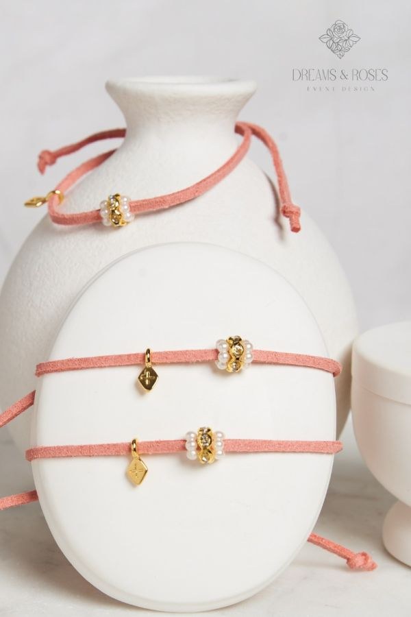 Προσδώστε μια διακριτική λάμψη στην τελετή σας με τα μαρτυρικά βάπτισης G-75. Το suede κορδόνι σε απόχρωση σάπιο μήλο φιλοξενεί έναν κομψό επίχρυσο σταυρό 24Κ και ένα κεντρικό στοιχείο από λευκές πέρλες με λαμπερά στρας. Μια επιλογή που ισορροπεί τέλεια ανάμεσα στη ρομαντική διάθεση και την πολυτέλεια.