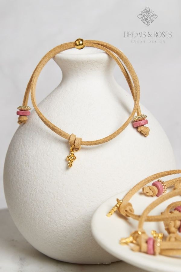 Υψηλή ποιότητα κατασκευής στα μαρτυρικά βάπτισης G-81. Το μπεζ suede κορδόνι στολίζεται με έναν επίχρυσο σταυρό 24Κ και κεραμικά στοιχεία σε χρώμα σάπιο μήλο, πλαισιωμένα από χρυσές ροδέλες. Ένα διαχρονικό σχέδιο που συνδυάζει την παράδοση με τα premium υλικά.
