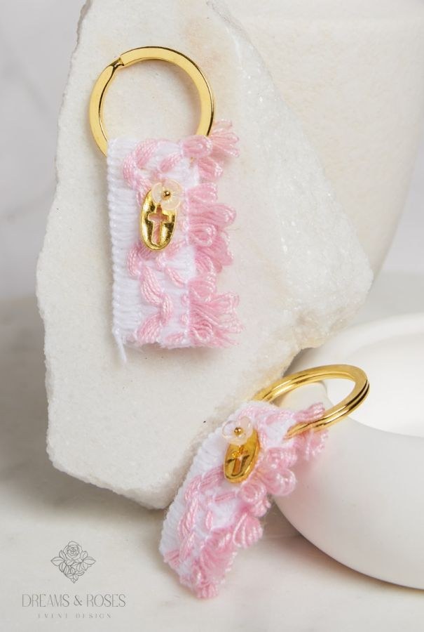 Το μαρτυρικό βάπτισης G-82 σε μορφή μπρελόκ είναι ένα ενθύμιο που ξεχωρίζει. Η περίτεχνη ροζ-λευκή υφαντή τρέσα συνδυάζεται με έναν επίχρυσο σταυρό και ένα μικρό, ντελικάτο ακρυλικό λουλουδάκι. Μια πανέμορφη και πρακτική επιλογή που θα θυμίζει στους καλεσμένους σας τη μοναδική αυτή μέρα.