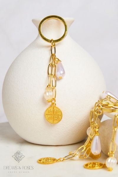 Μια luxury και διαχρονική επιλογή είναι τα μαρτυρικά βάπτισης G-84 σε μορφή μπρελόκ. Διαθέτουν μια κομψή χρυσή αλυσίδα από την οποία κρέμονται πέρλες σε σχήμα σταγόνας και ένα εντυπωσιακό μεταλλικό Κωνσταντινάτο. Ένα σύμβολο πίστης και προστασίας που αποτελεί ένα πολύτιμο δώρο για τους καλεσμένους σας.
