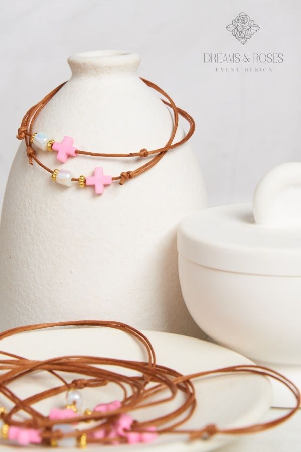 Μαρτυρικά βάπτισης Βραχιόλι με Ακρυλικό Ροζ Σταυρό & Πολύμορφο Κρυσταλλάκι