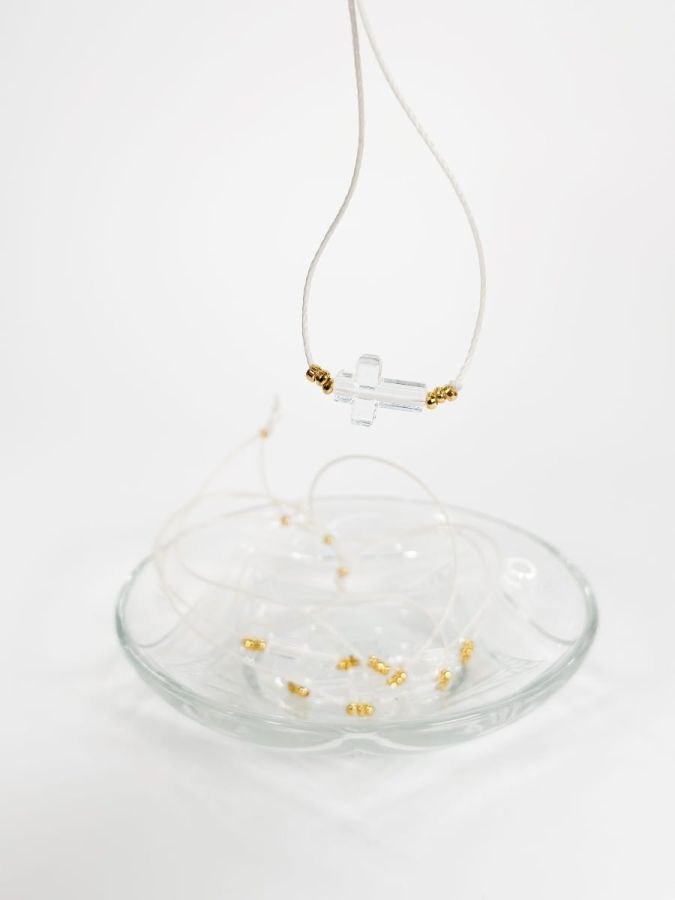 Μαρτυρικό βραχιόλι με λευκό κορδόνι,διάφανο ακρυλικό σταυρό.