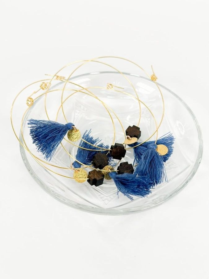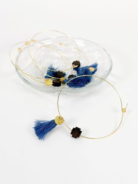 Μαρτυρικό βραχιόλι με memory, μπλε φούντα, φλουρί και ξύλινο σταυρό.