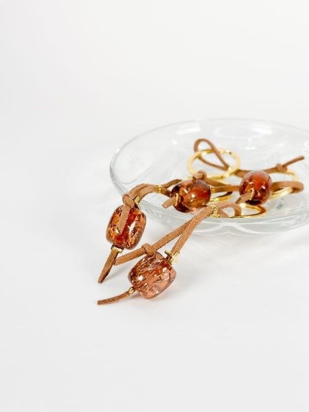Μαρτυρικό μπρελοκ με καφέ σουετ,επιχρυσωμένο σταυρό και καφέ χάντρα με γκλιττερ.