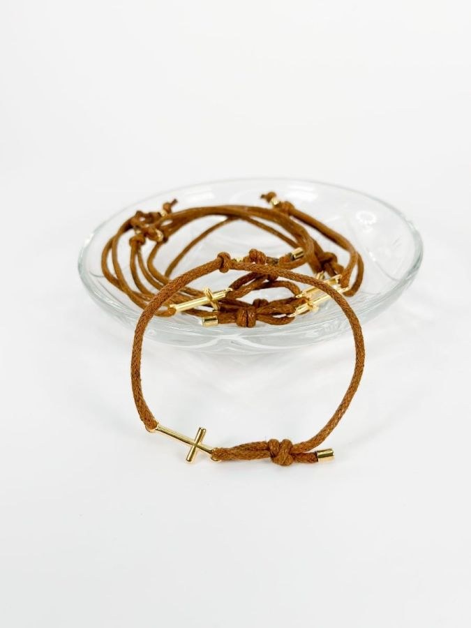 Μαρτυρικό βραχιόλι με καφέ κορδόνι και μακρόστενο επιχρυσωμένο σταυρό.