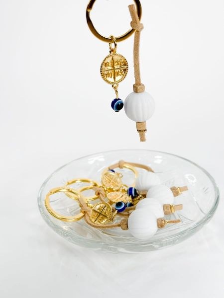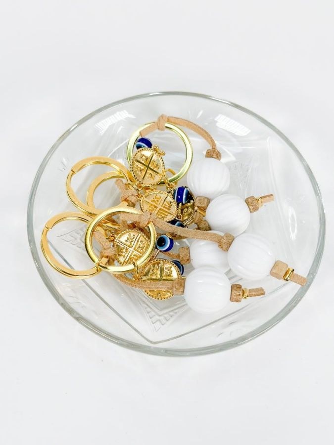 Μαρτυρικό μπρελοκ με κωνσταντινάτο,μπλε μάτι και άσπρη χάντρα.