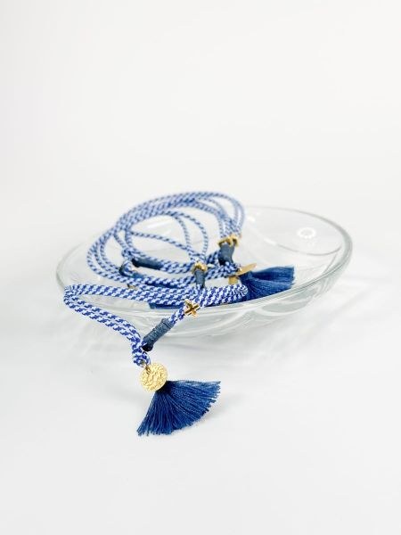 Μαρτυρικό βραχιόλι με δίχρωμο μπλε|άσπρο κορδόνι,μπλε φούντα,επιχρυσωμένο σταυρό και φλουρί.