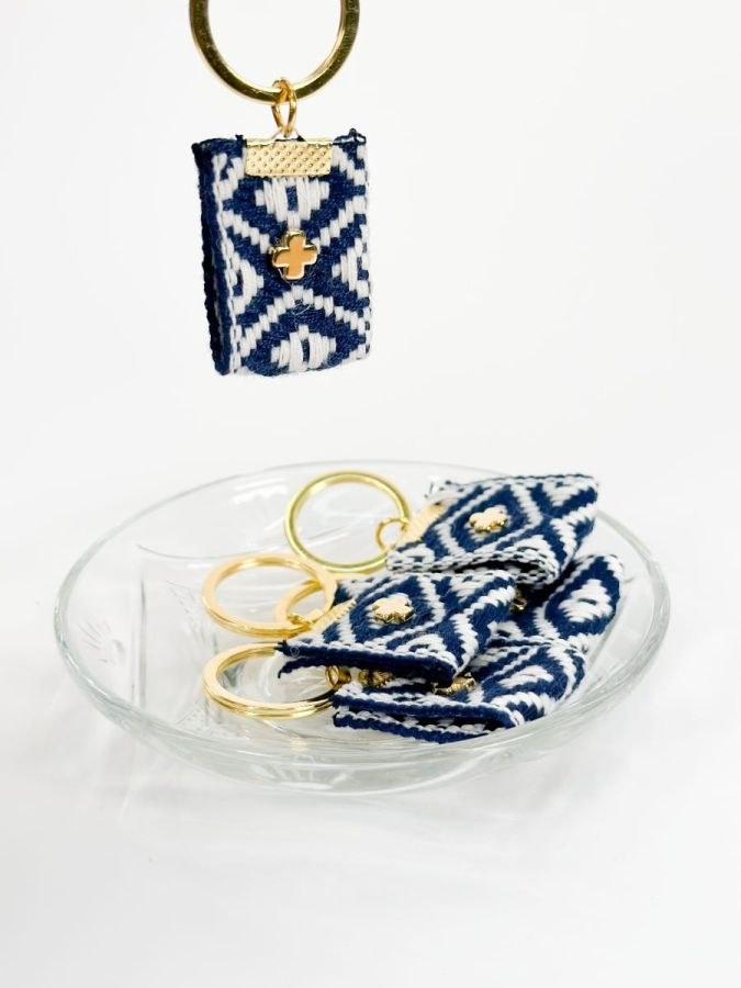 Μαρτυρικό μπρελοκ με δίχρωμη άσπρη|μπλε τρέσα και επιχρυσωμένο κολλητό σταυρό.