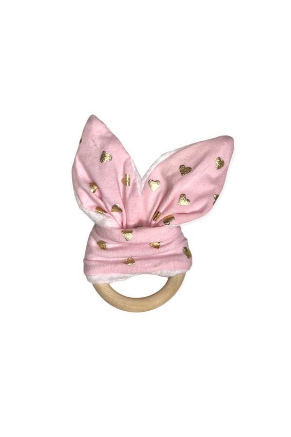 Λαγουδακι μασητικο για μωρά ροζ με χρυσες καρδουλες
