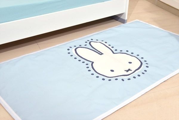 Παιδικό μονόχρωμο χαλί διακοσμημένο με το κουνελάκι της Miffy, σε σιέλ χρώμα. Το εσωτερικό του είναι από πολυεστερική βάτα για να προστατεύει το μωράκι σας την ώρα του παιχνιδιού.