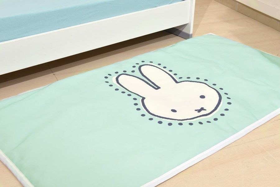 Παιδικό μονόχρωμο χαλί διακοσμημένο με το κουνελάκι της Miffy, σε κίτρινο χρώμα. Το εσωτερικό του είναι από πολυεστερική βάτα για να προστατεύει το μωράκι σας την ώρα του παιχνιδιού.