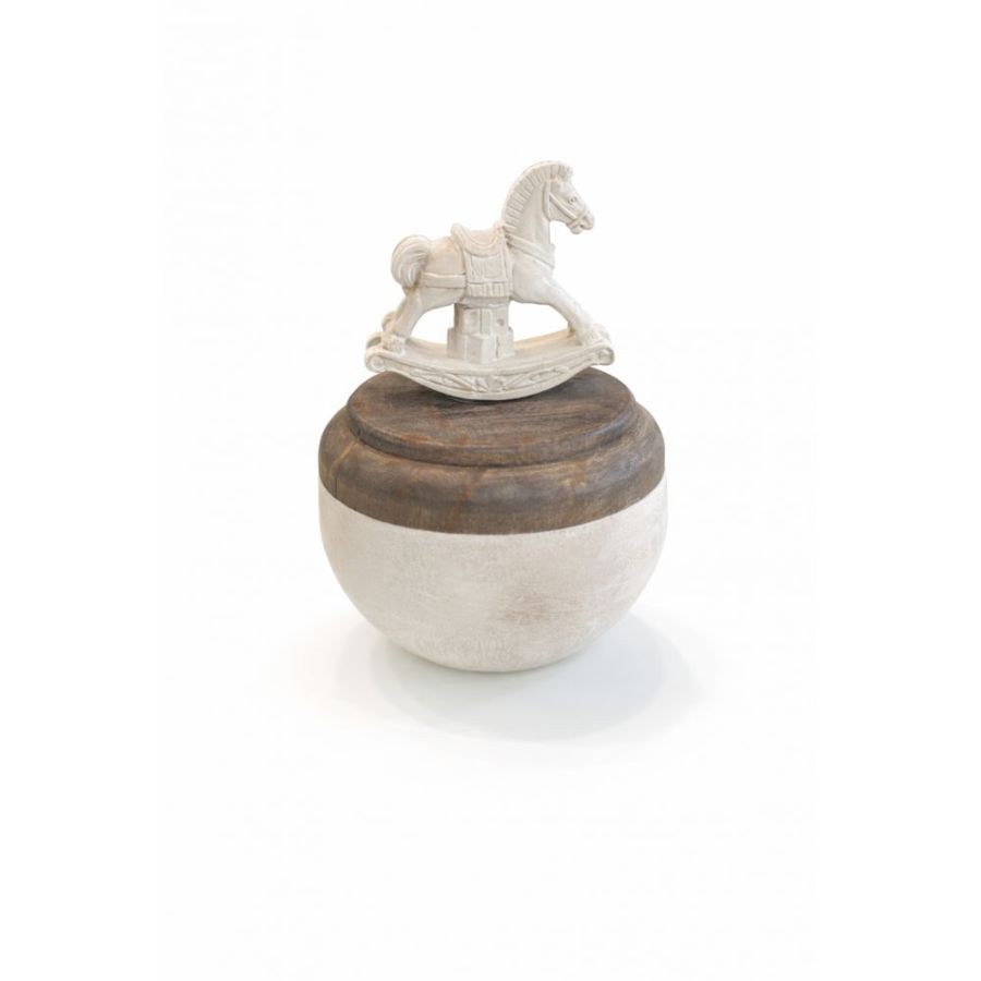 Το προϊόν παρουσιάζει μια εξαιρετική αρμονία υλικών, ξεκινώντας από τη βάση του που είναι ένα σφαιρικό κεραμικό μπολ σε απαλή μπεζ-ζαχαρί απόχρωση με διακριτική πατίνα που θυμίζει παλαιωμένο αντικείμενο. Το καπάκι είναι κατασκευασμένο από φυσικό ξύλο σε σκούρα καρυδί απόχρωση, δημιουργώντας μια ζεστή αντίθεση με την ανοιχτόχρωμη κεραμική βάση. Στην κορυφή δεσπόζει ένα ανάγλυφο κεραμικό αλογάκι καρουζέλ, φιλοτεχνημένο με απίστευτη λεπτομέρεια στη σέλα και τη χαίτη, διατηρώντας την ίδια vintage μπεζ παλέτα. Η στιβαρότητα της κατασκευής και η ποιότητα του φινιρίσματος υπογραμμίζουν τον πολυτελή χαρακτήρα αυτής της ιδιαίτερης μπομπονιέρας.