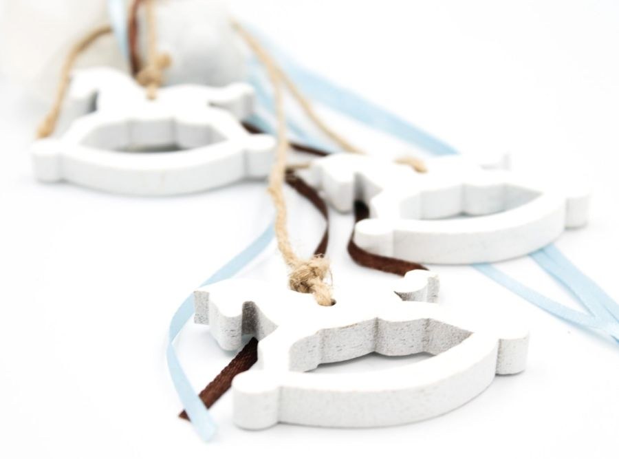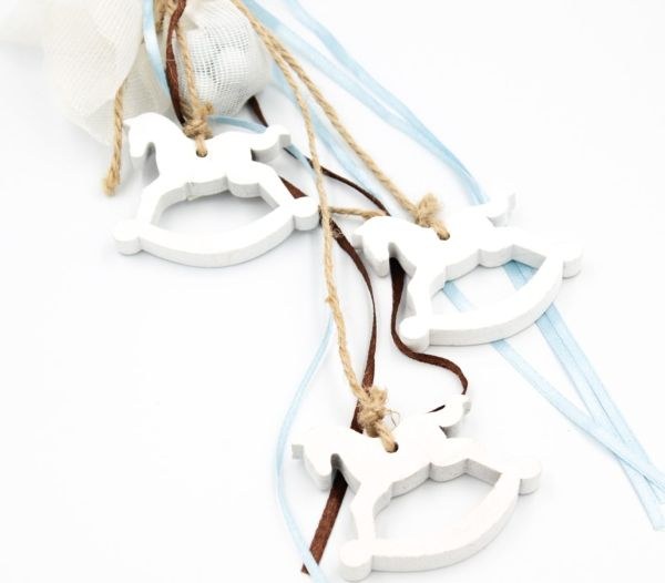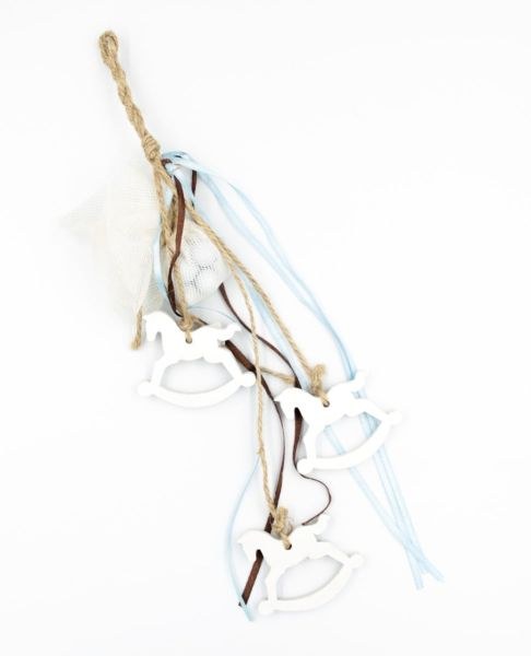 Κρεμαστή μπομπονιέρα βάπτισης με τρία ξύλινα αλογάκια καρουζέλ.