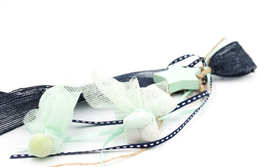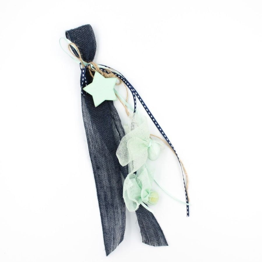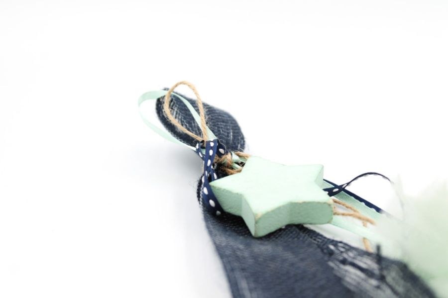 Κρεμαστή μπομπονιέρα σε αποχρώσεις μπλε σκούρο και βεραμάν, με ξύλινο βεραμάν αστέρι.