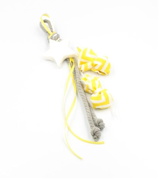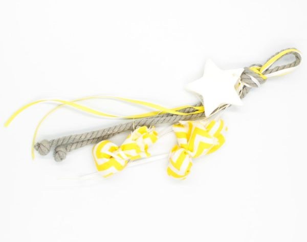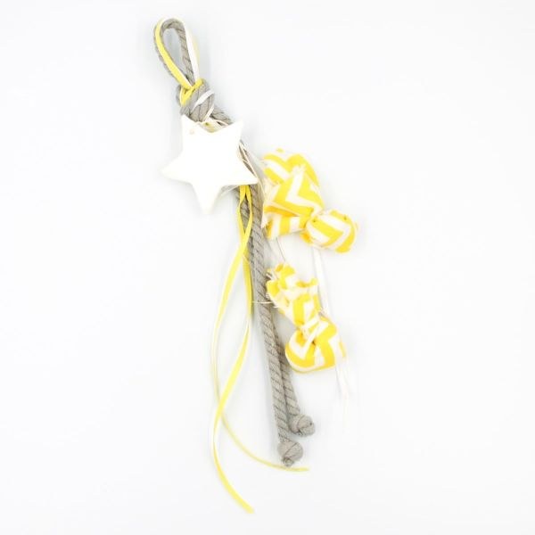 Κρεμαστή μπομπονιέρα με αρωματισμένο σαπούνι σε σχήμα αστεριού και πουγκάκια σεβρον κίτρινα για τα κουφέτα.