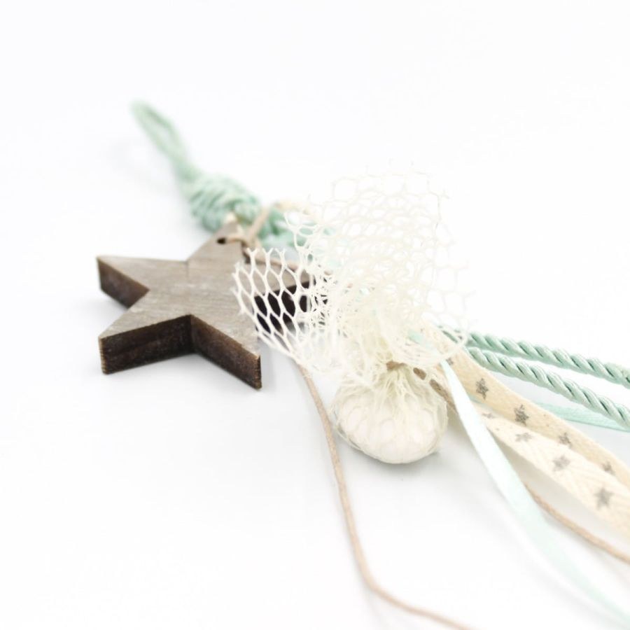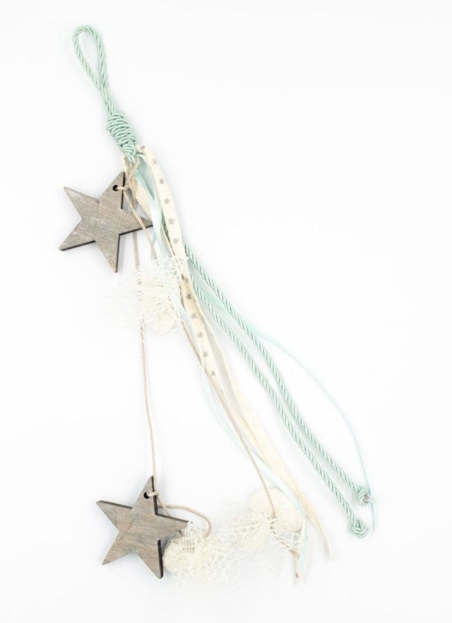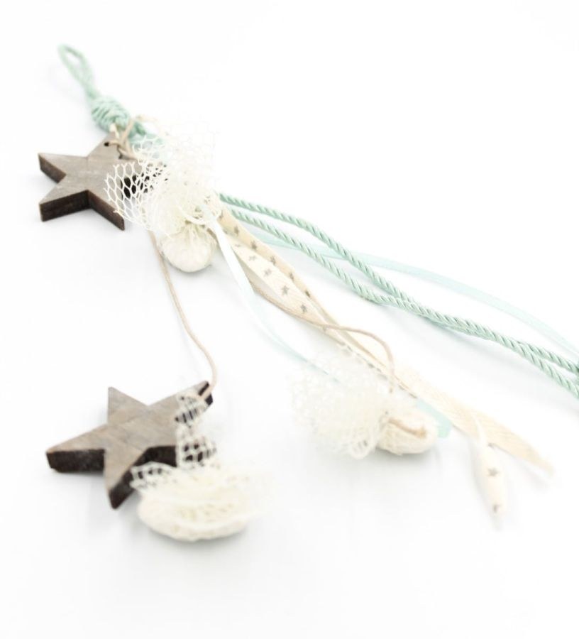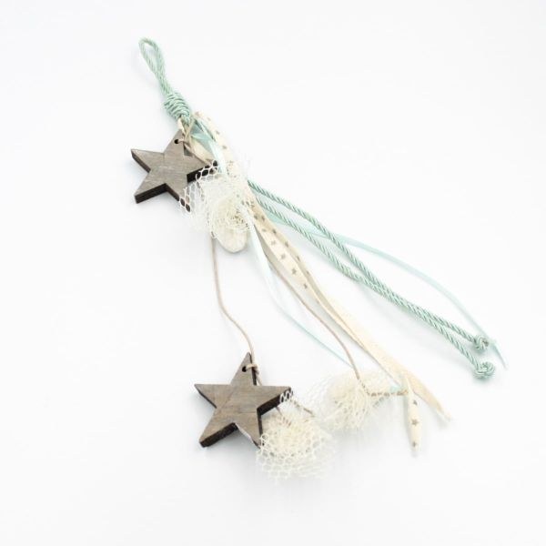 Κρεμαστή μπομπονιέρα σε βεραμάν αποχρώσεις με 2 ξύλινα αστέρια.