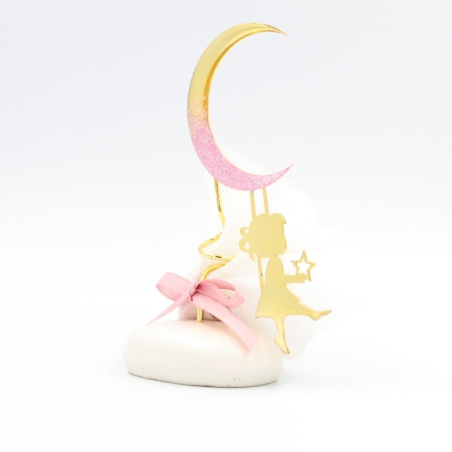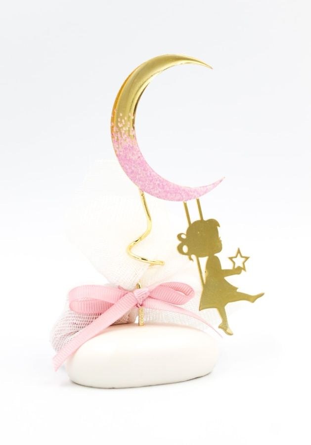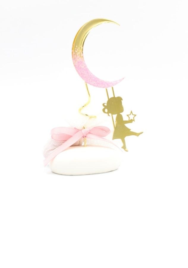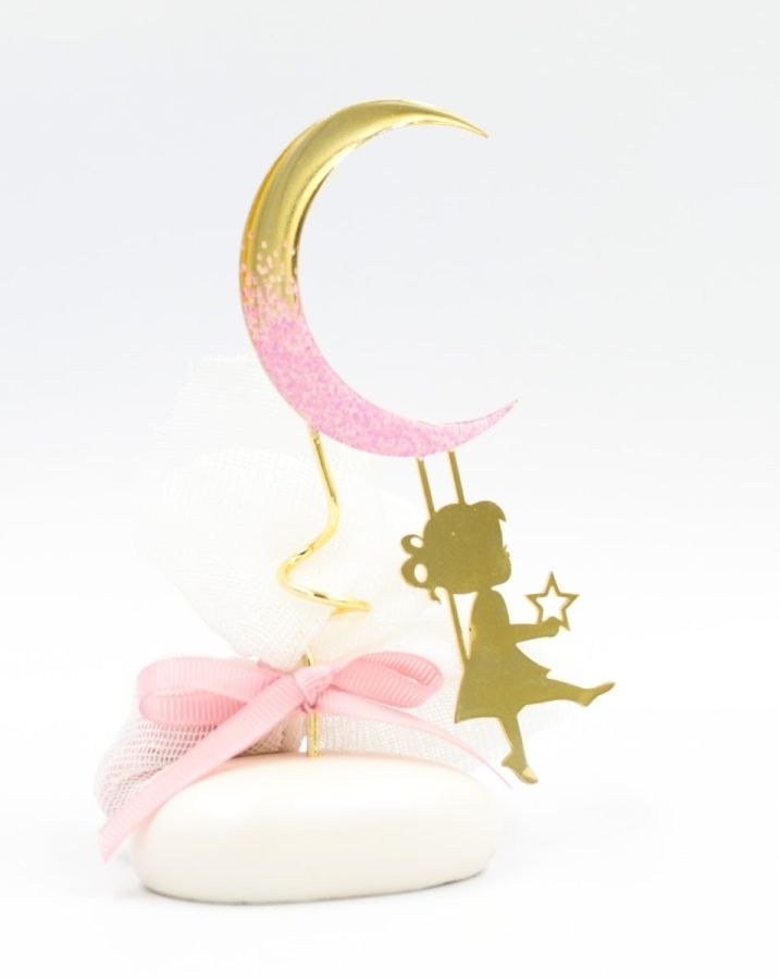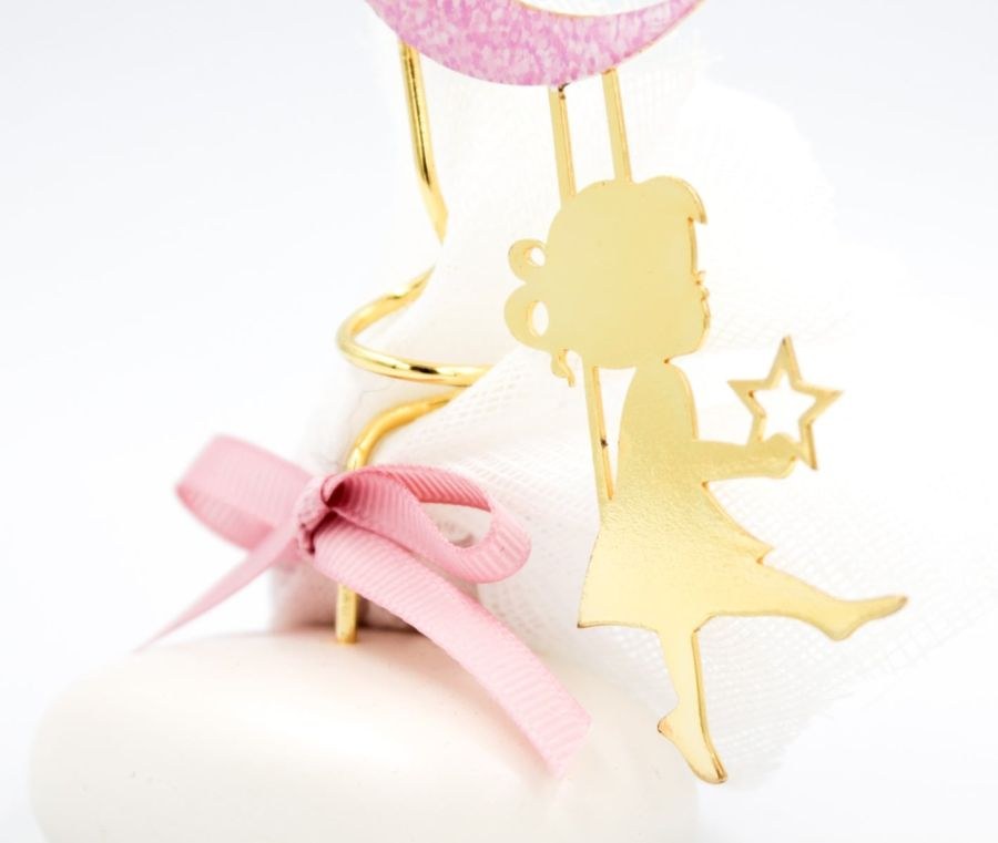Μπομπονιέρα βάπτισης βότσαλο με μεταλλικό κοριτσάκι, φεγγάρι-αστέρι, σε ροζ-χρυσό χρώμα.