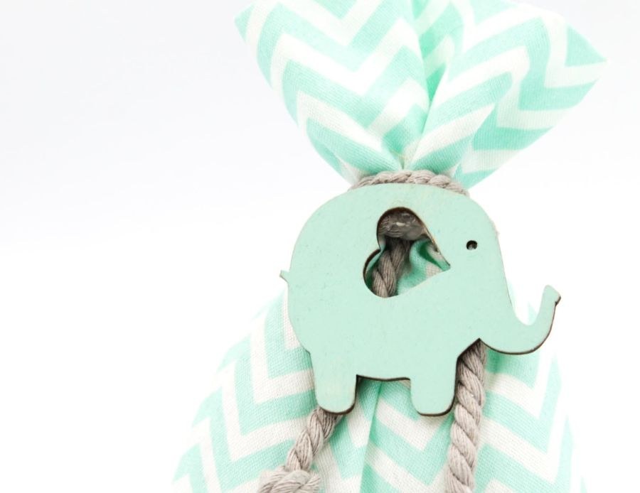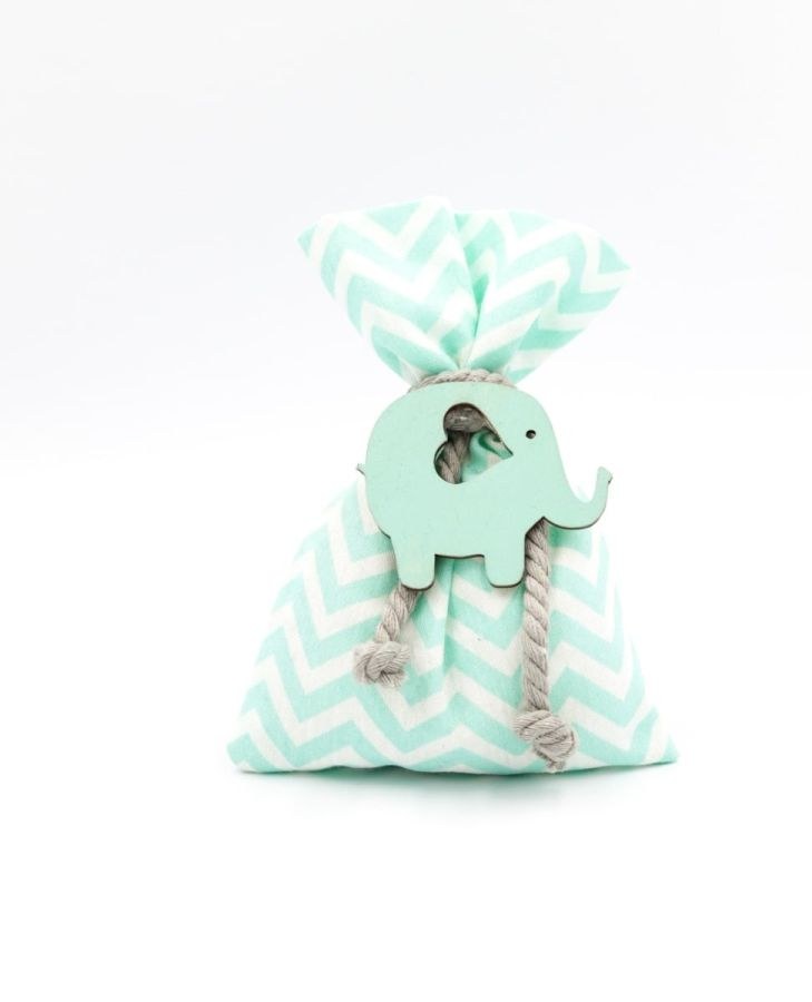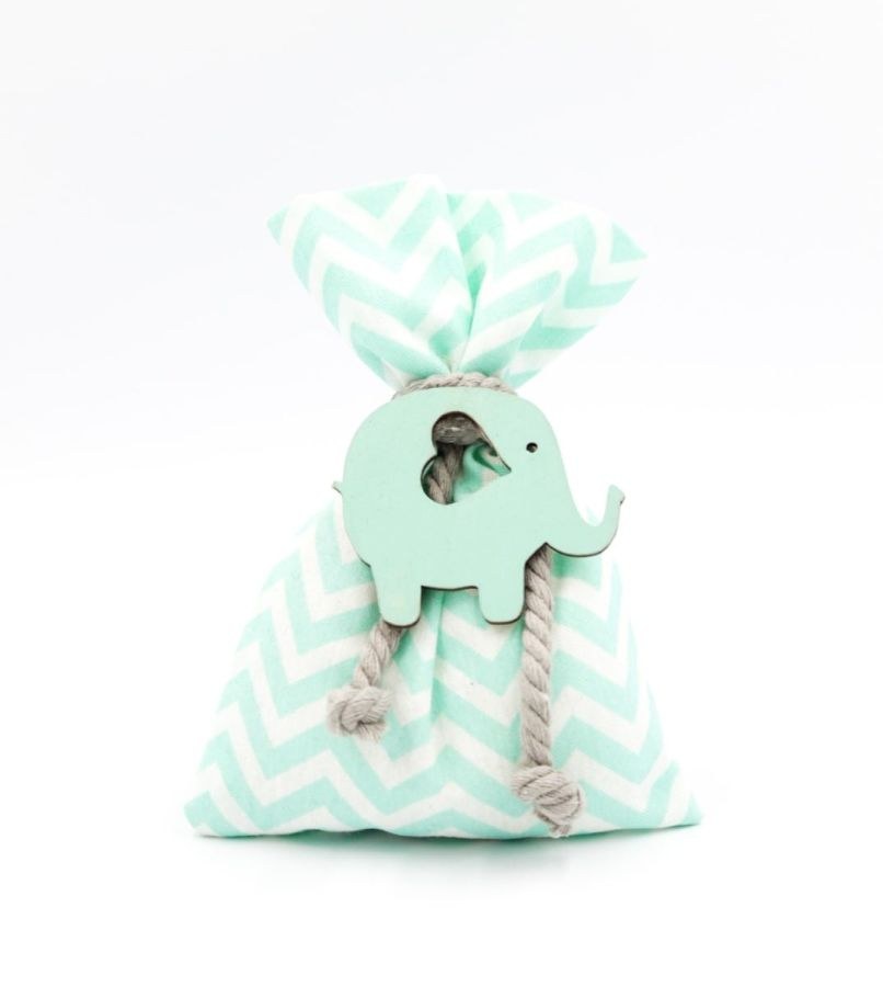 Μπομπονιέρα βάπτισης με βαμβακερό πουγκί σεβρόν βεραμάν με κορδόνι 3κλωνο βαμβακερό μπεζ και ξύλινο βεραμάν ελέφαντα.