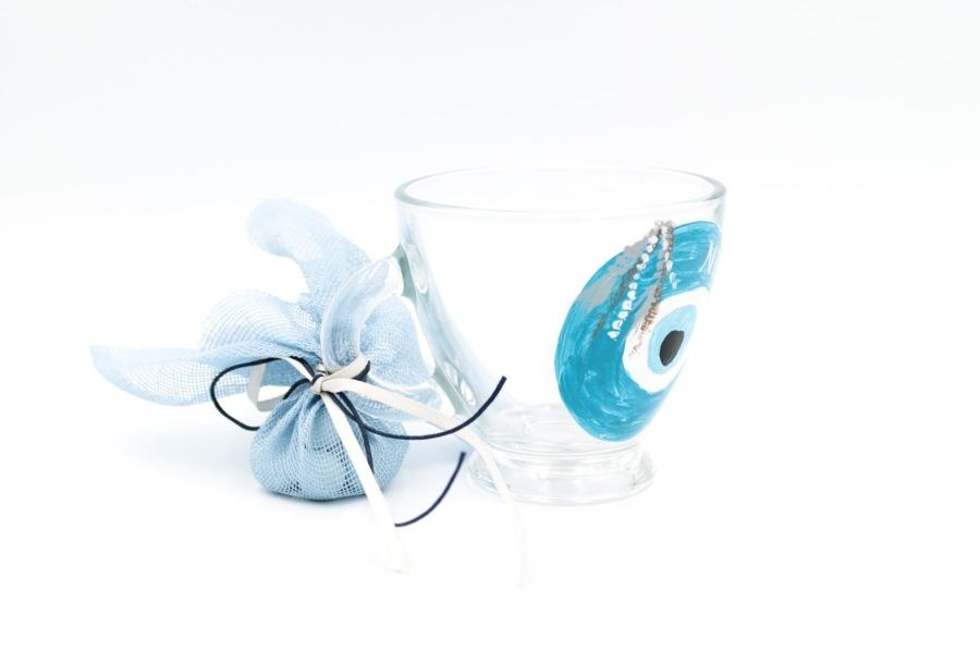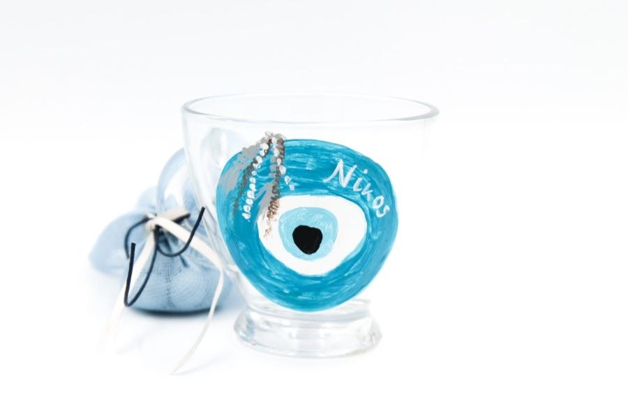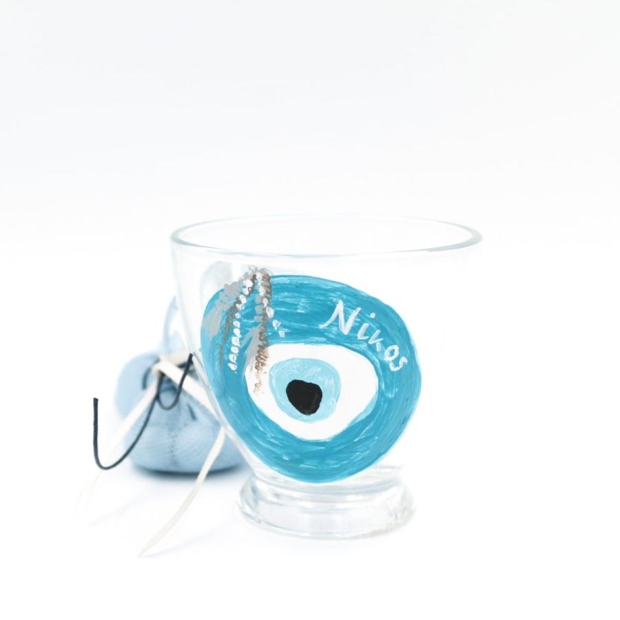 Μπομπονιέρα Βάπτισης διάφανη κούπα με ζωγραφιά με θέμα το μάτι.