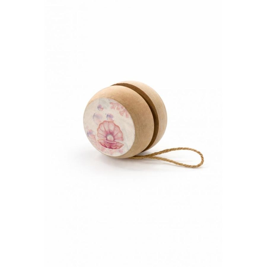 Το προϊόν είναι κατασκευασμένο από φυσικό ξύλο εξαιρετικής ποιότητας, με λεία υφή και στρογγυλεμένες γωνίες που αναδεικνύουν τη ζεστασιά του υλικού. Στην πλαϊνή επιφάνεια δεσπόζει ένα καλλιτεχνικό print σε κυκλικό λευκό καμβά, το οποίο απεικονίζει μια ανοιγμένη αχιβάδα με μια λαμπερή πέρλα στο κέντρο της. Οι αποχρώσεις του "dusty pink", του μοβ και οι διακριτικές φυσαλίδες πλαισιώνουν το σχέδιο, προσδίδοντας μια παραμυθένια και υποθαλάσσια αύρα. Η σύνθεση ολοκληρώνεται με το σχοινί σε φυσική απόχρωση, το οποίο εξασφαλίζει τη σωστή λειτουργία του γιο-γιο, διατηρώντας παράλληλα την οργανική και ρουστίκ ταυτότητα του αντικειμένου.