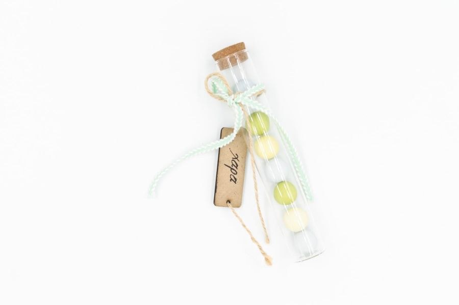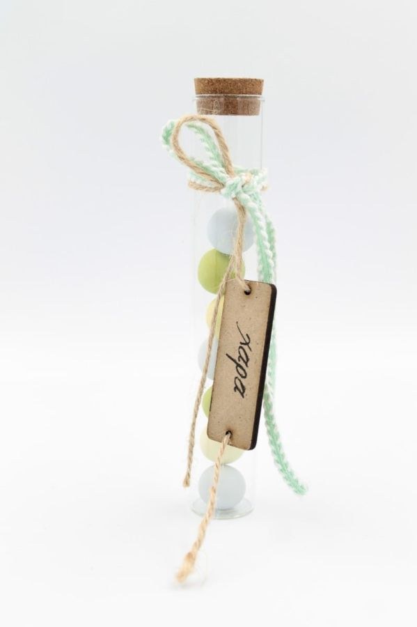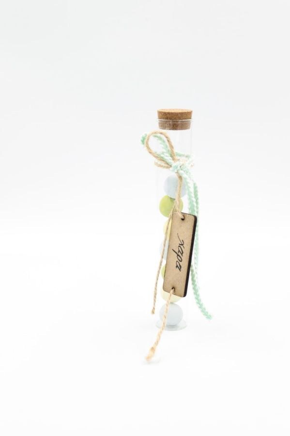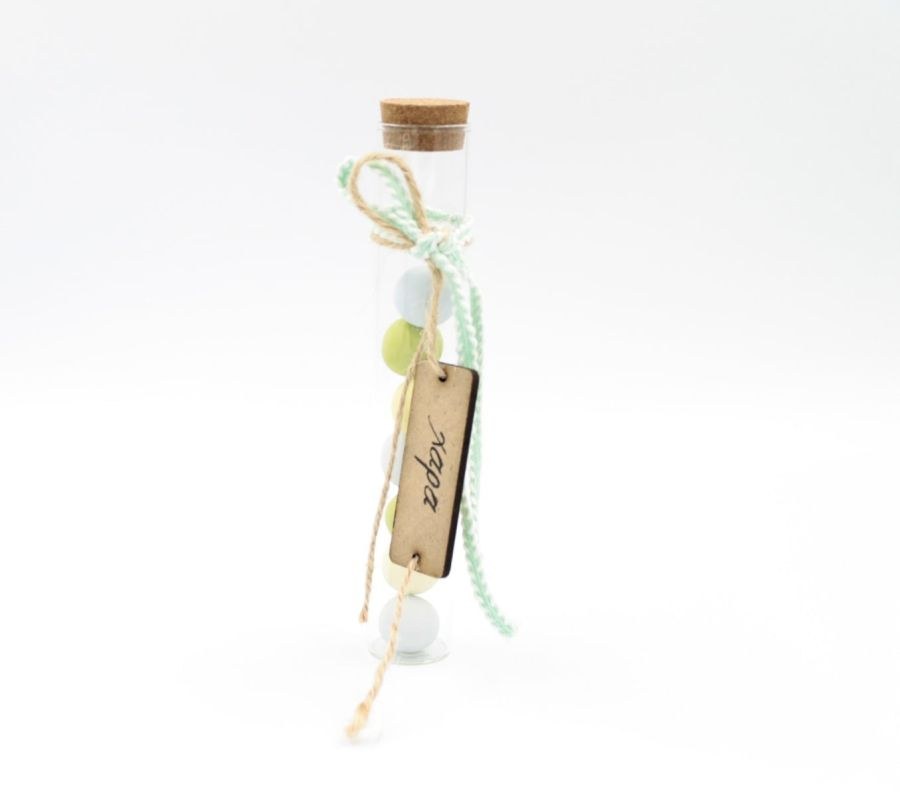 Μπομπονιέρα Βάπτισης γυάλινος δοκιμαστικός σωλήνας με δέσιμο και ξύλινο ταμπελάκι με όνομα.