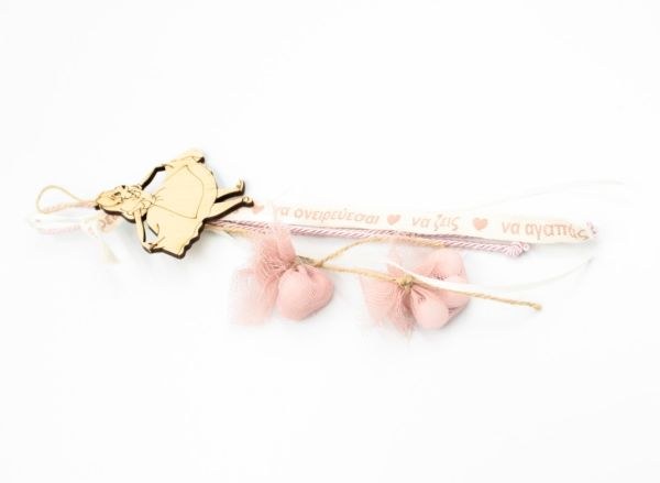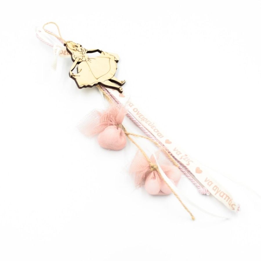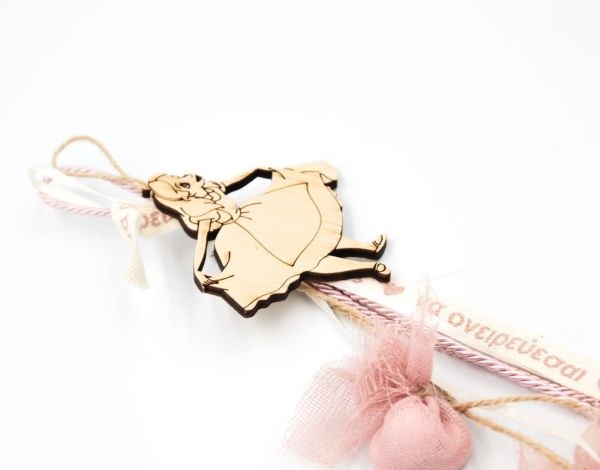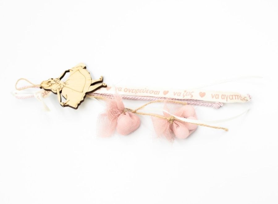 Κρεμαστή μπομπονιέρα βάπτισης με ξύλινο διακοσμητικό με την Αλίκη στην χώρα των θαυμάτων.