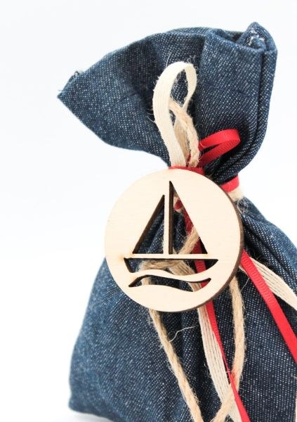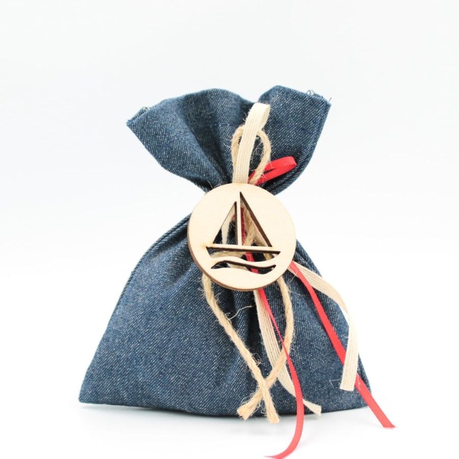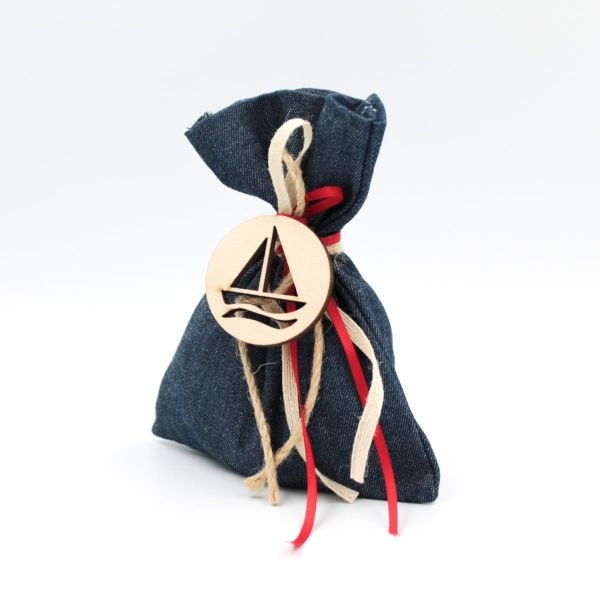 Μπομπονιέρα Βάπτισης πουγκί τζιν μπλε με κορδέλες, σπάγγο και ξύλινο διακοσμητικό καραβάκι.