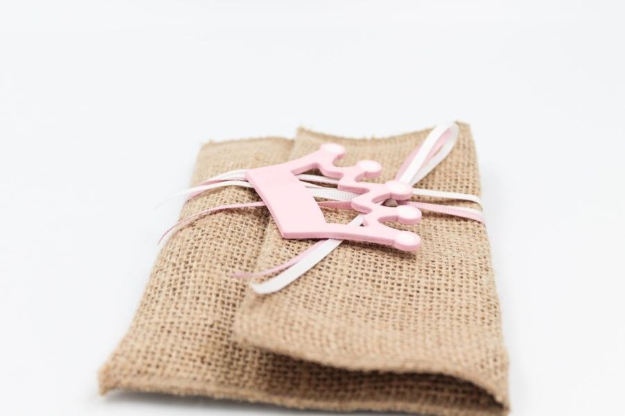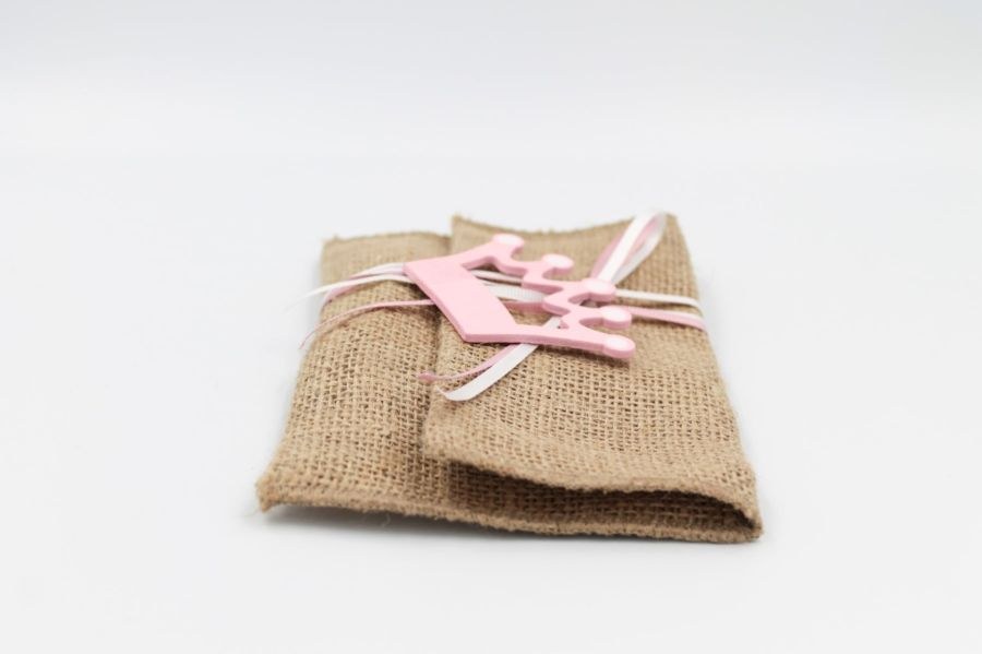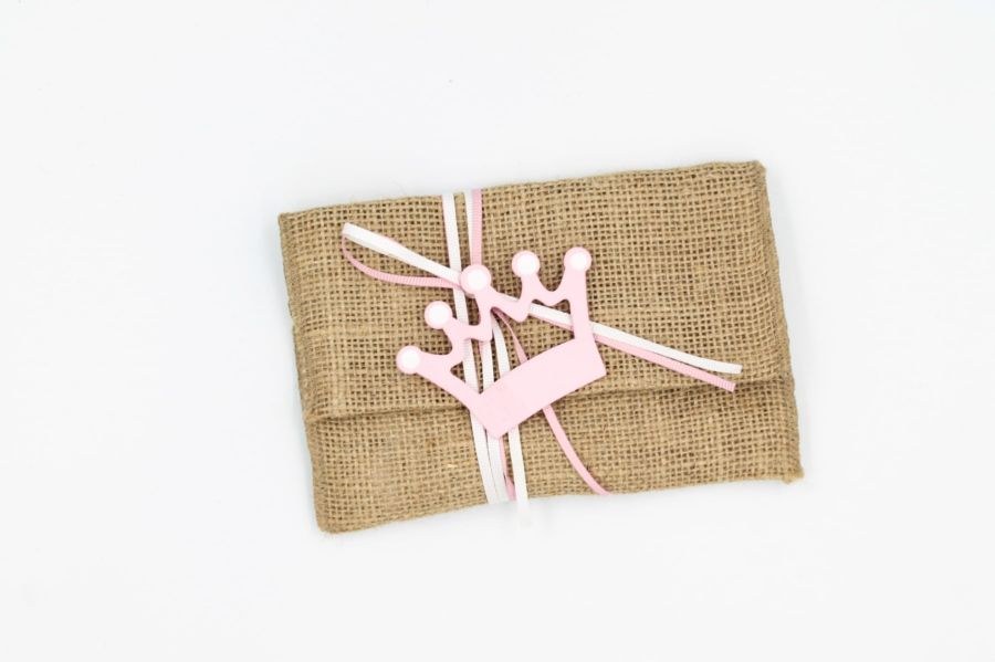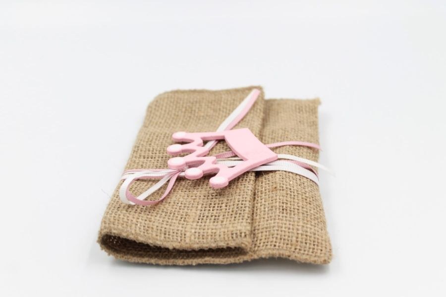 Μπομπονιέρα Βάπτισης ροζ φάκελος λινάτσα με ξύλινη διακόσμηση κορώνα.