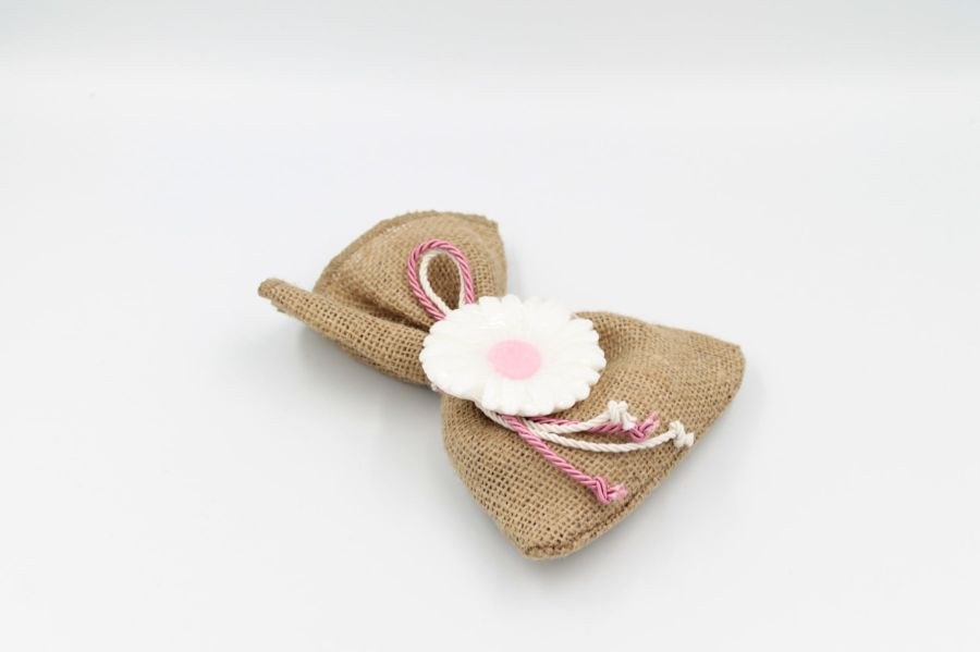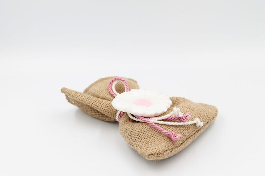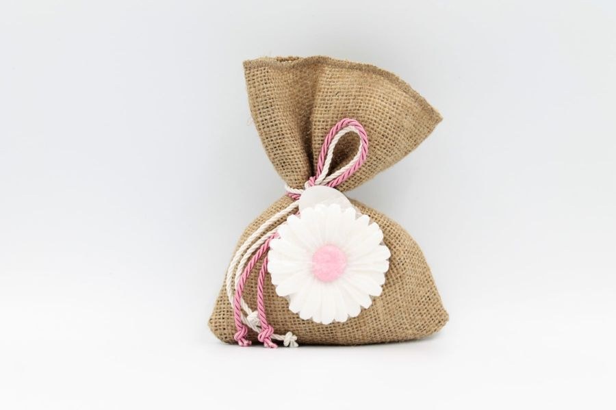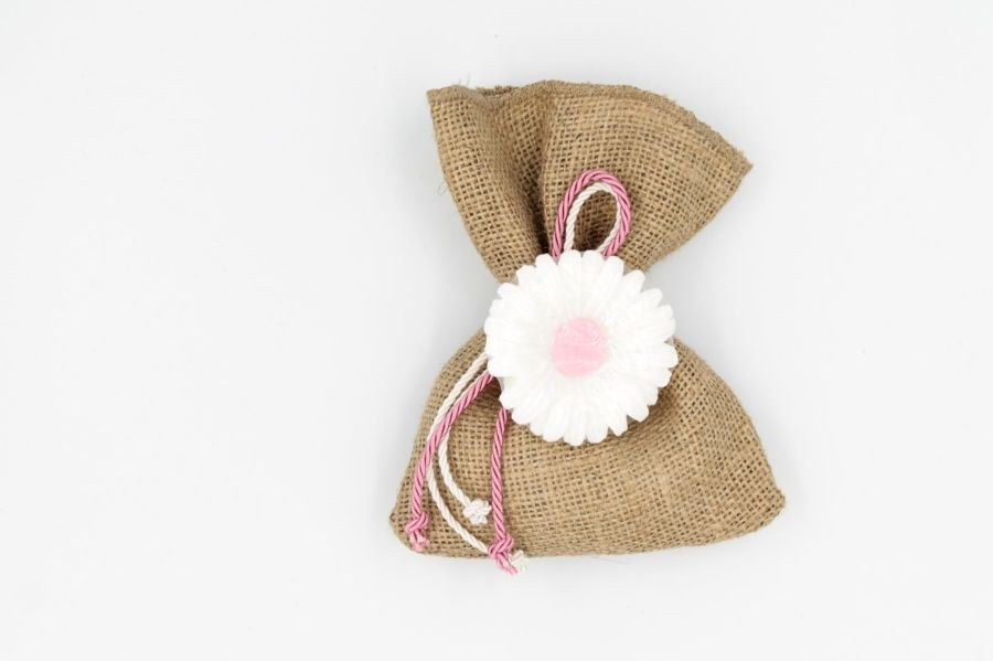 Μπομπονιέρα Βάπτισης πουγκί λινάτσα με 3κλωνα κορδόνια σε ροζ και λευκό, και διακοσμητικό σαπούνι σε σχήμα λουλουδιού.