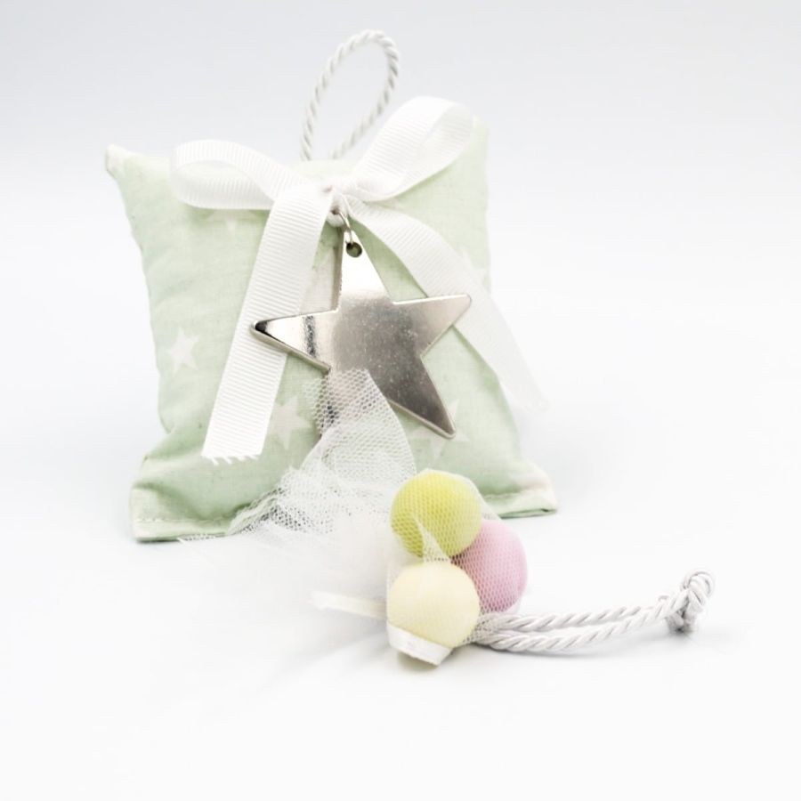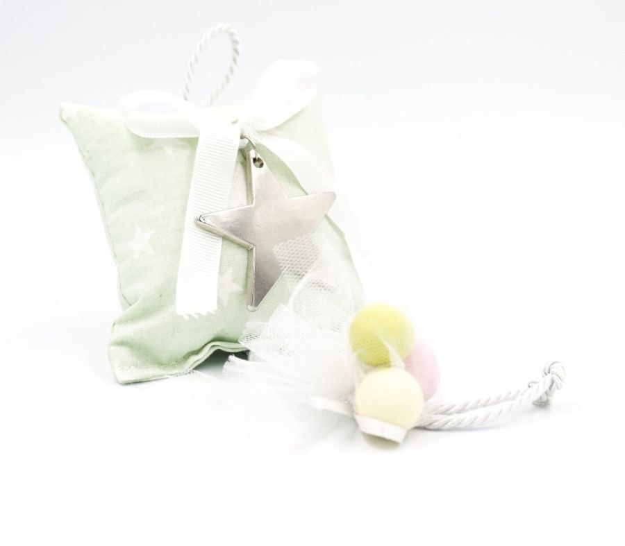 Μπομπονιέρα βάπτισης μαξιλαράκι βεραμάν με αστεράκια και μεταλλικό αστέρι ασημί.