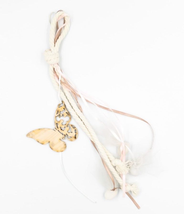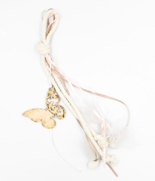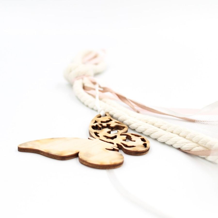 Μπομπονιέρα βάπτισης κρεμαστή με ξύλινη πεταλούδα, δέσιμο με τρίκλωνο βαμβακερό εκρού και κορδέλες ροζ και στο χρωμα της μόκας.
