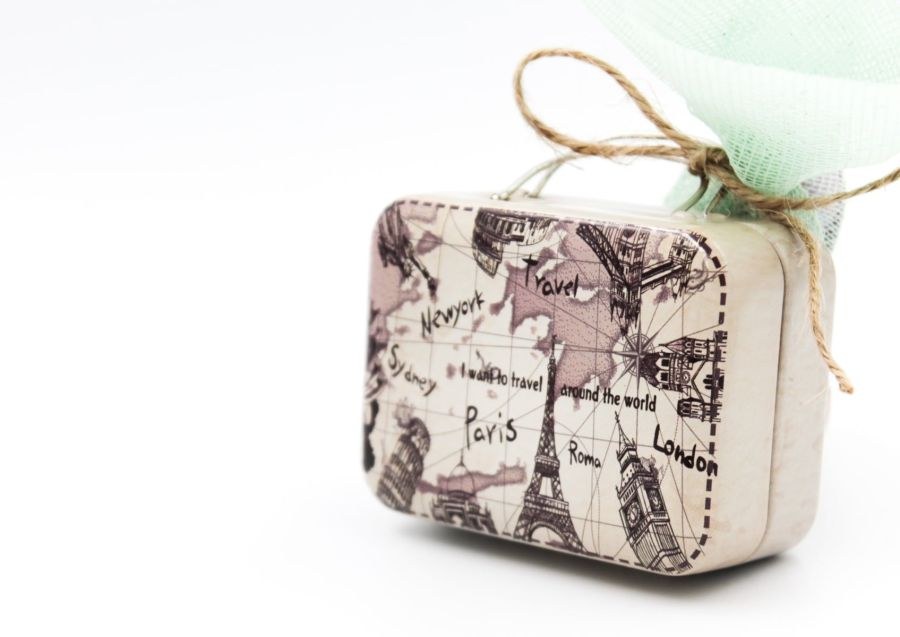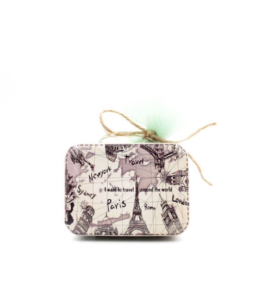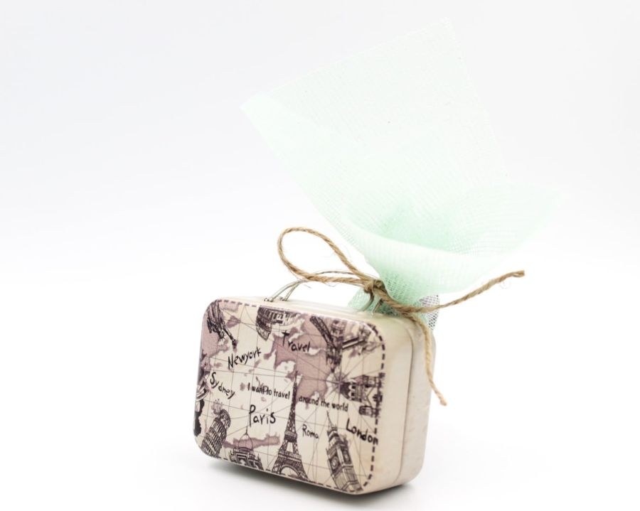 Μπομπονιέρα βάπτισης μεταλλικό βαλιτσάκι με θέμα το ταξίδι.