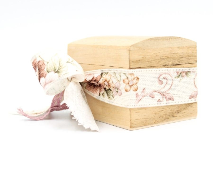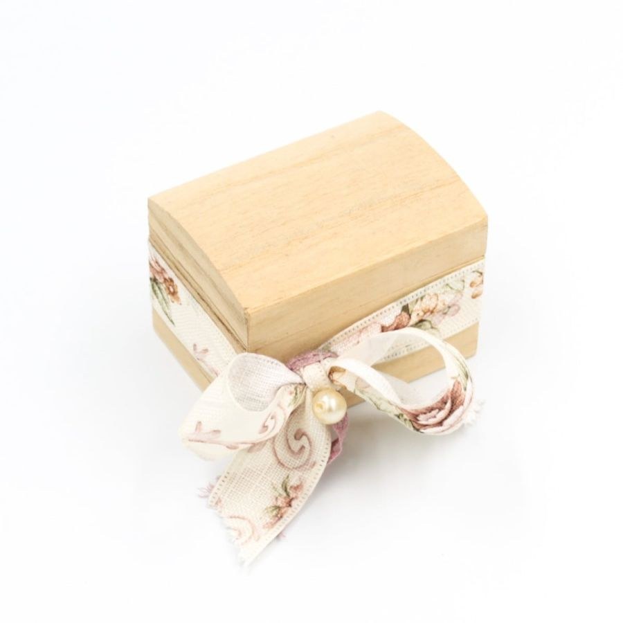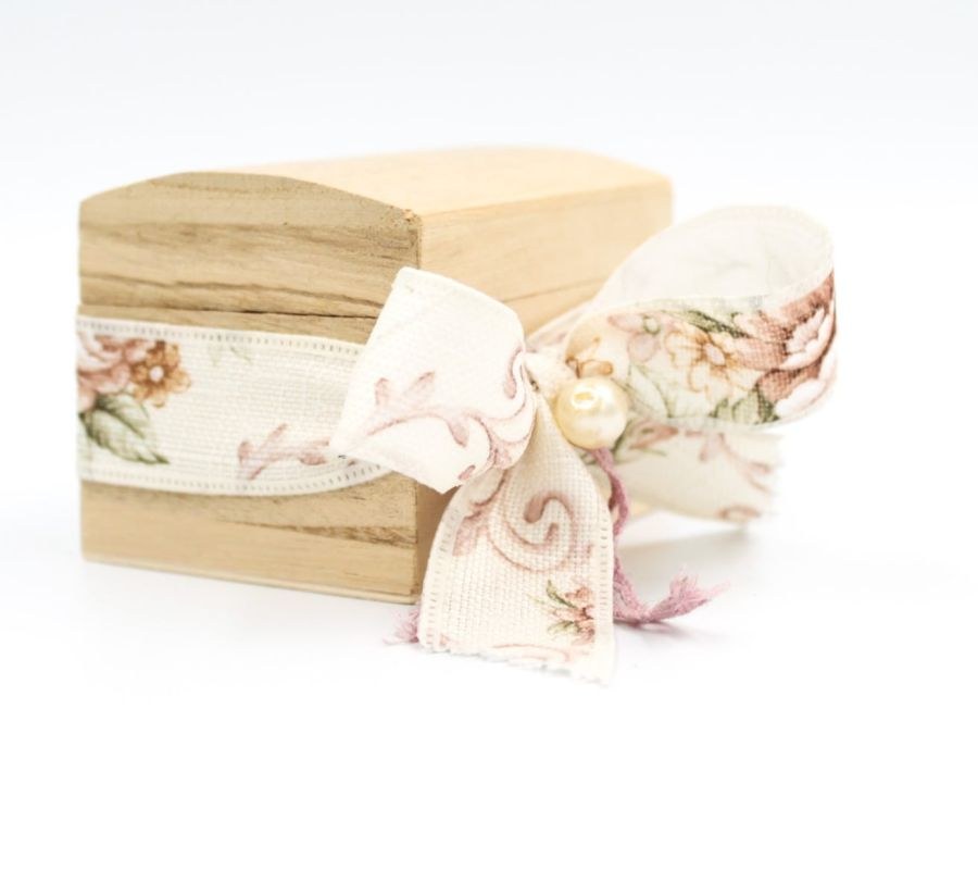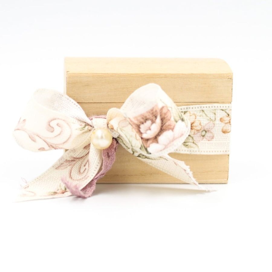 Μπομπονιέρα βάπτισης μπαουλάκι ξύλινο με δέσιμο κορδέλα floral και πέρλα.