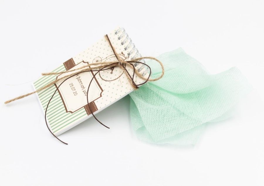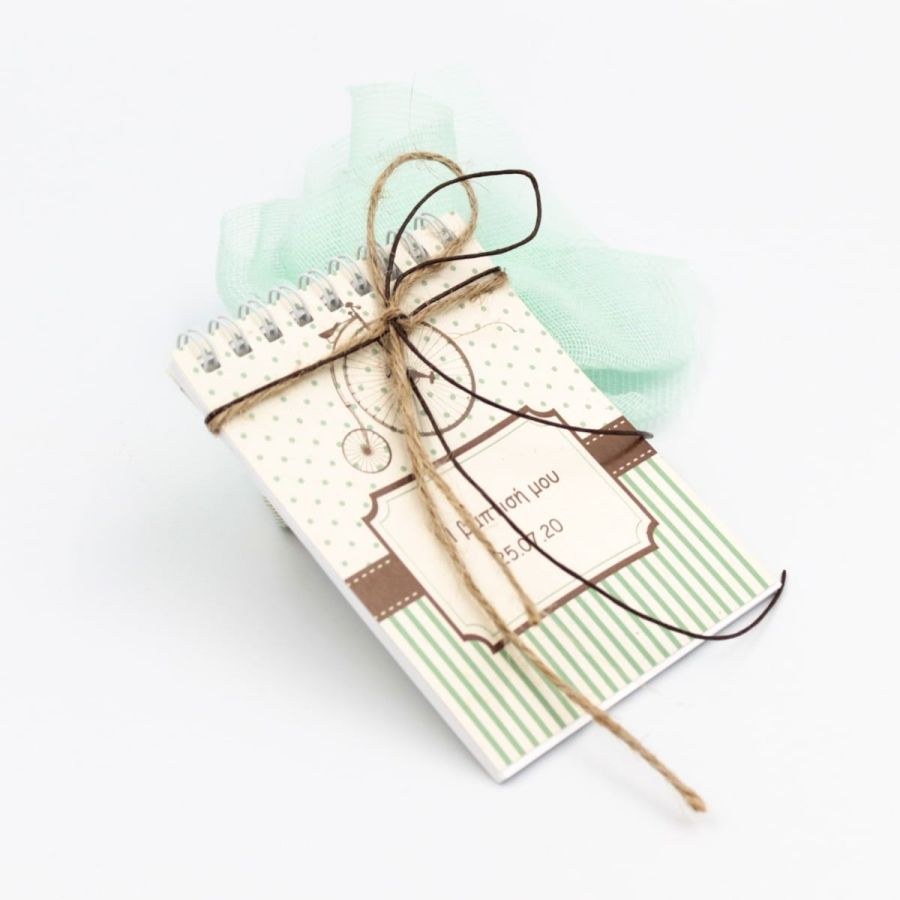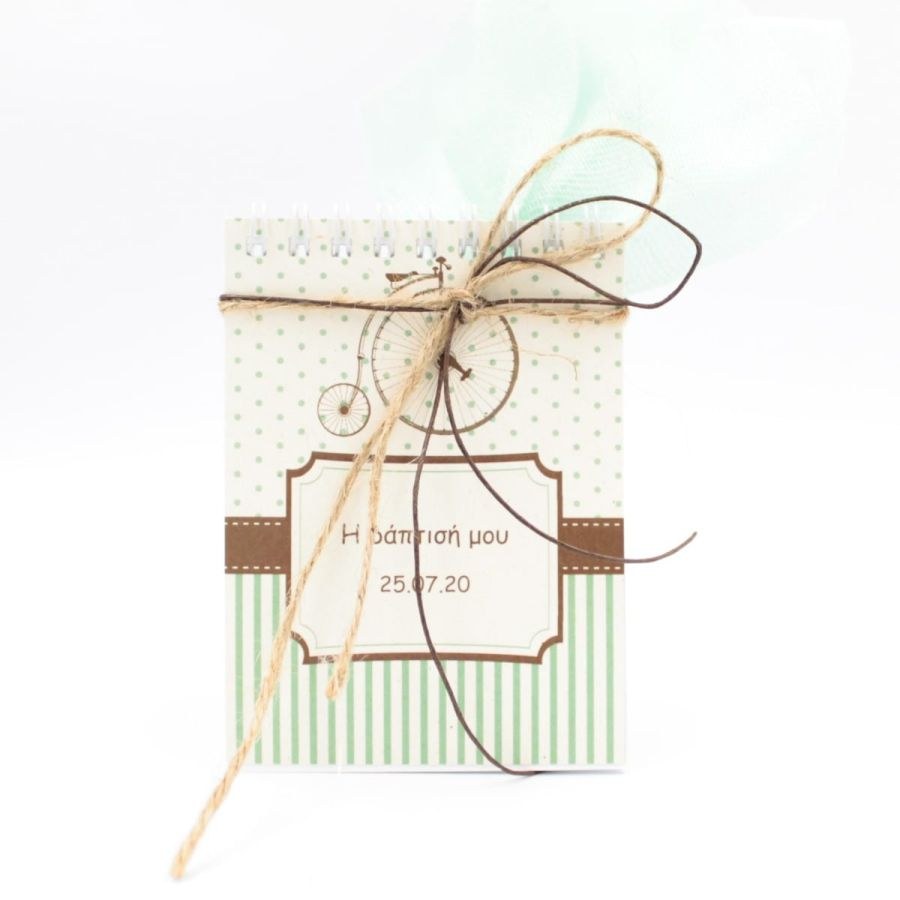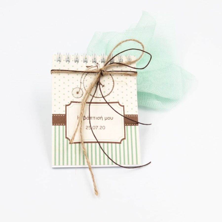 Μπομπονιέρα βάπτισης μπλοκάκι εκτυπωμένο θεματικά με κηρομπογιές.