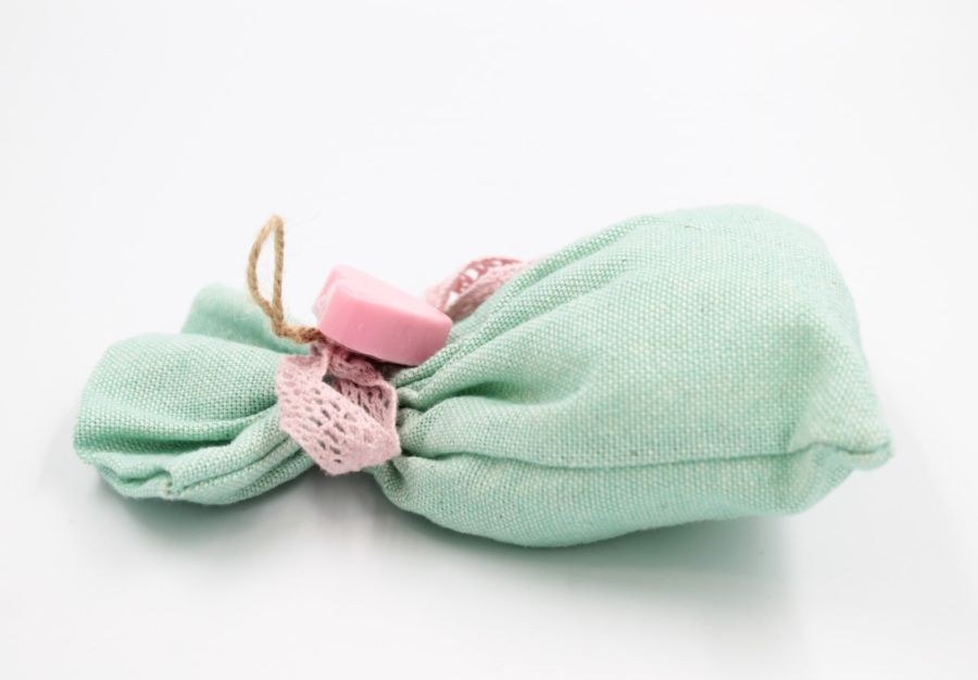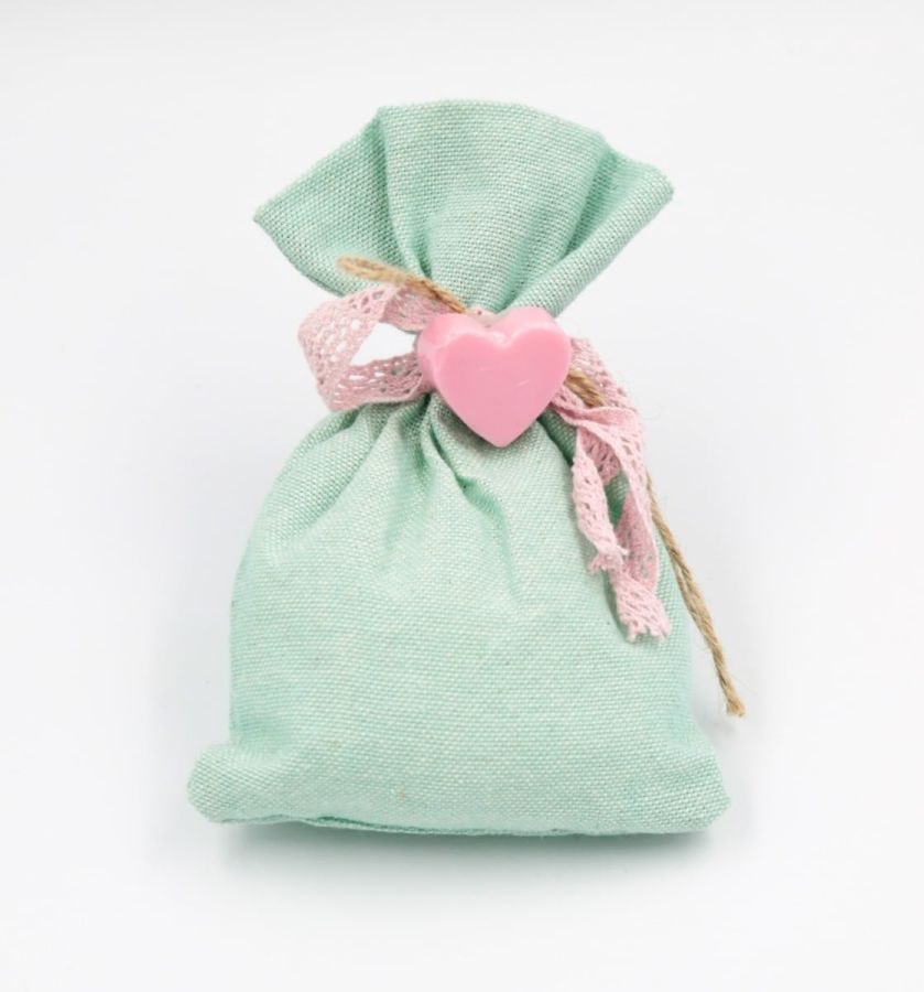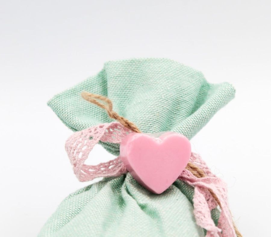 Μπομπονιέρα βάπτισης πουγκί βαμβακερό βεραμάν με αρωματικό σαπουνάκι σε σχήμα καρδιάς ροζ.