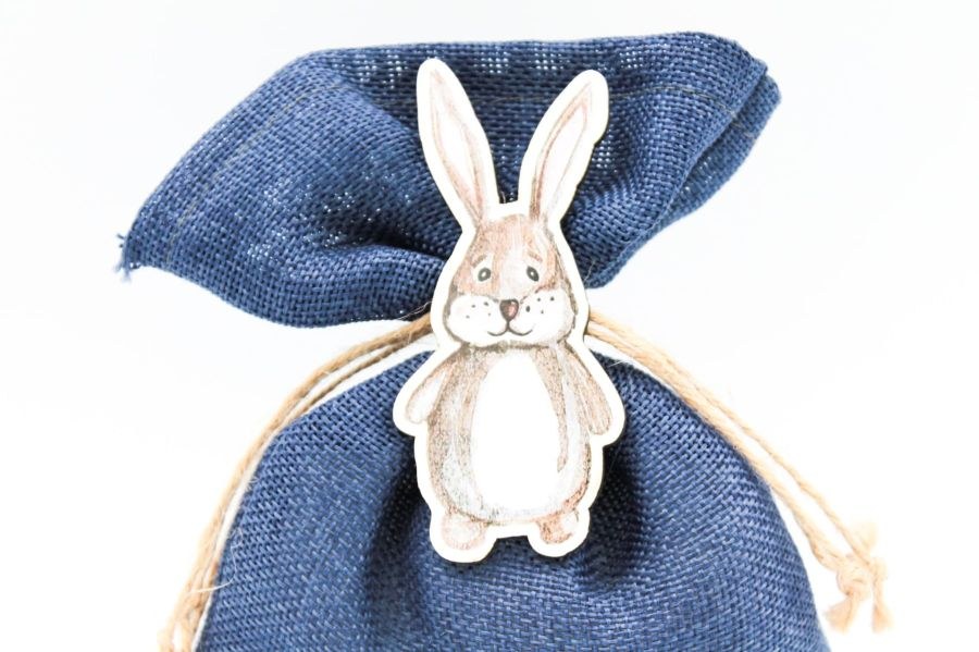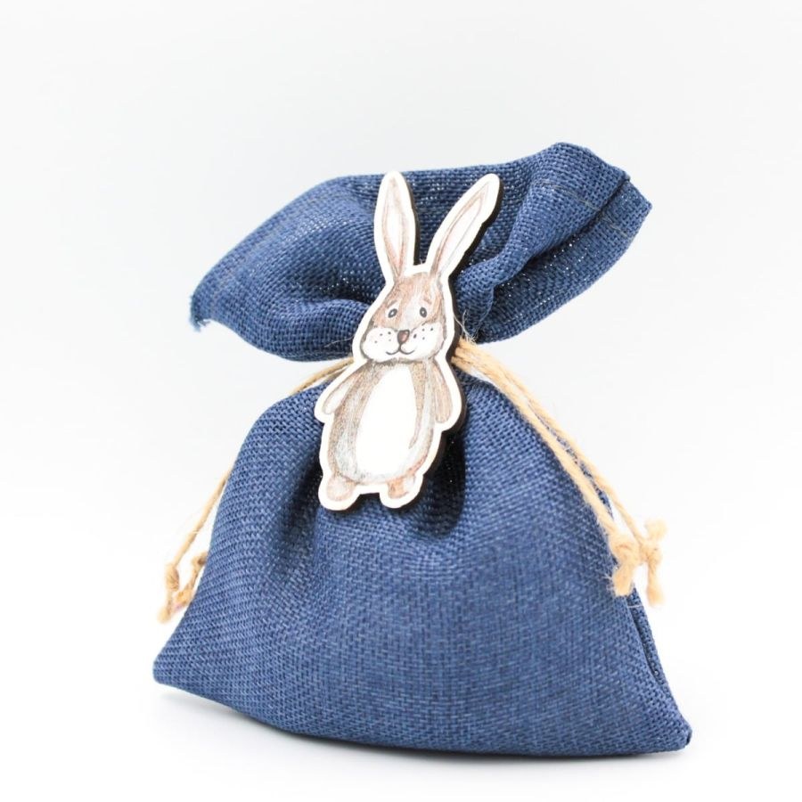 Μπομπονιέρα Βάπτισης βαμβακερό πουγκί σε μπλε χρώμα με ξύλινο διακοσμητικό με θέμα τα ζωάκια του δάσους.