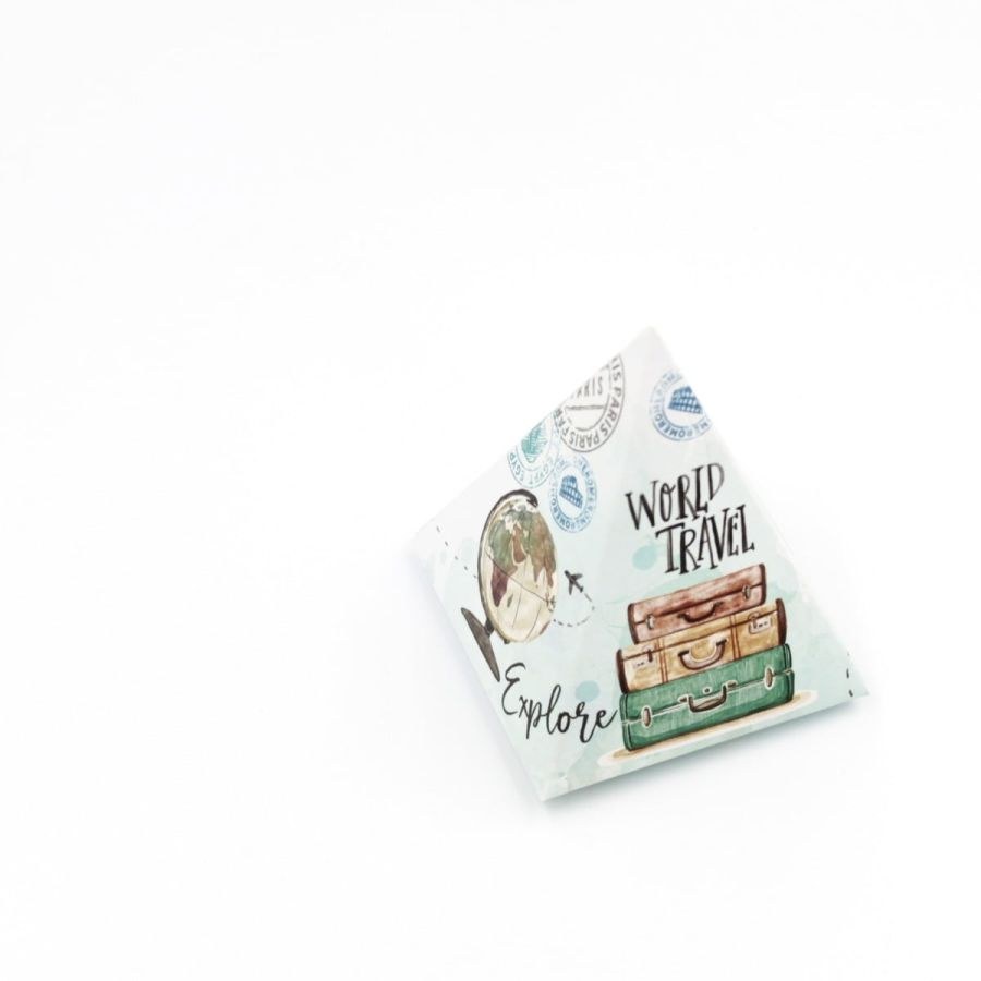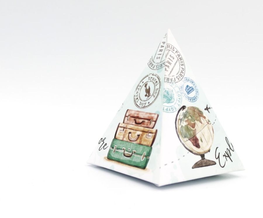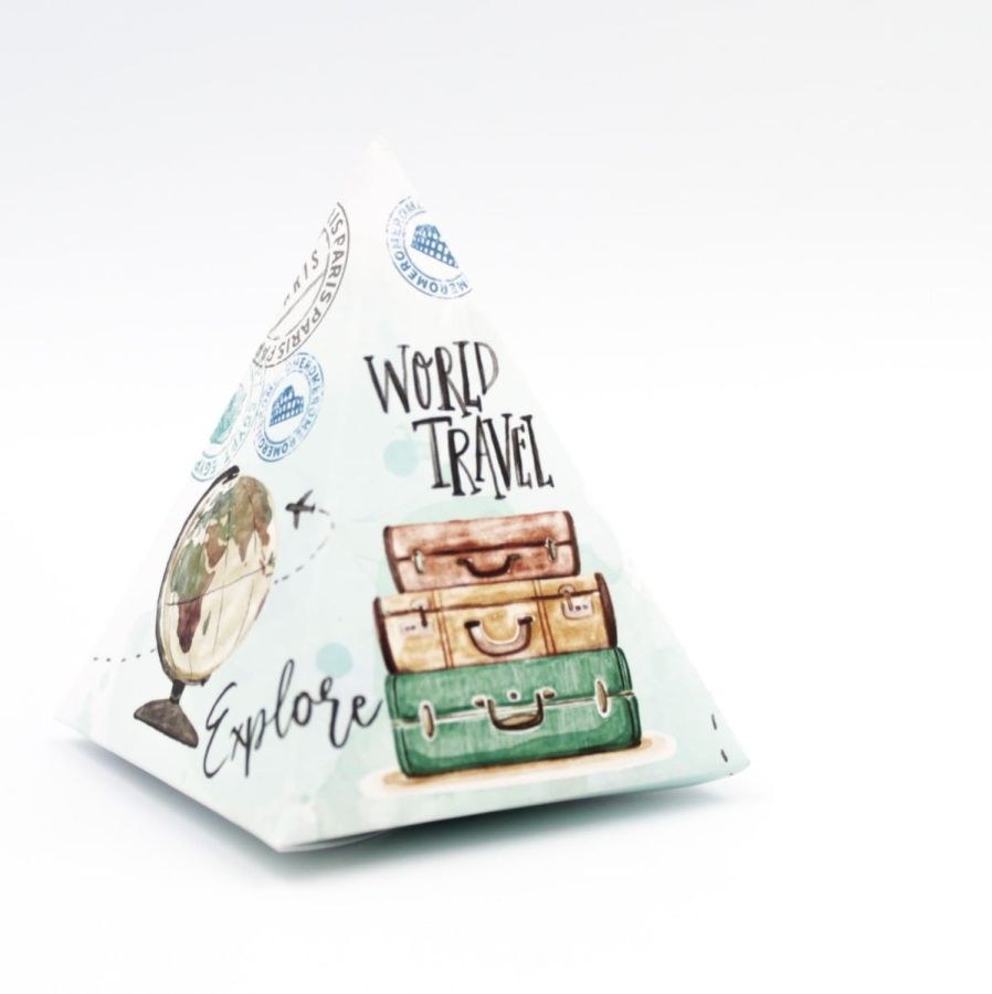 Μπομπονιέρα βάπτισης χάρτινη πυραμίδα με εκτύπωση με θέμα το ταξίδι.