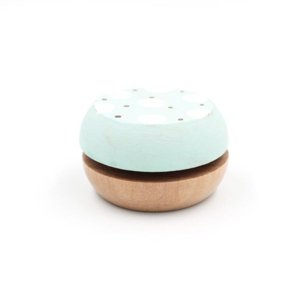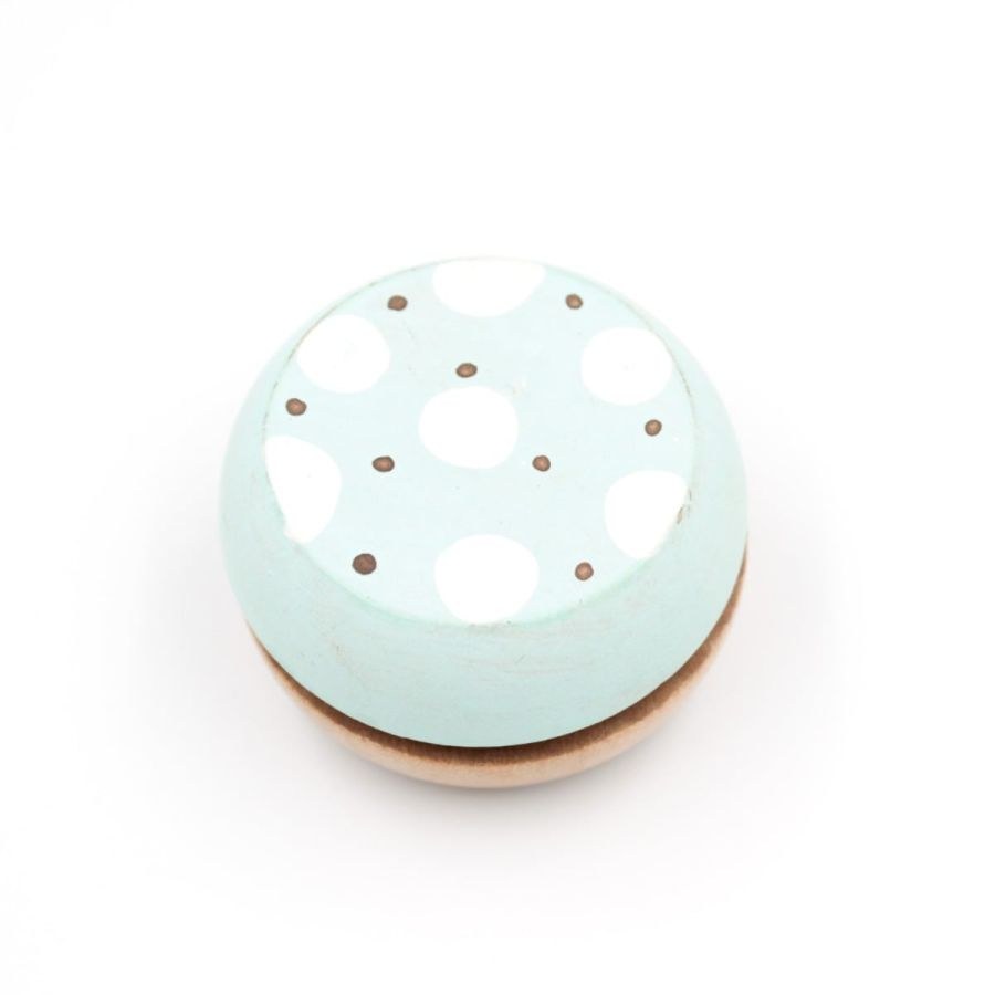 Μπομπονιέρα βάπτισης ξύλινο γιο-γιο ζωγραφισμένο βεραμάν με πουά λευκό γκρι.