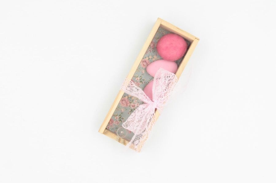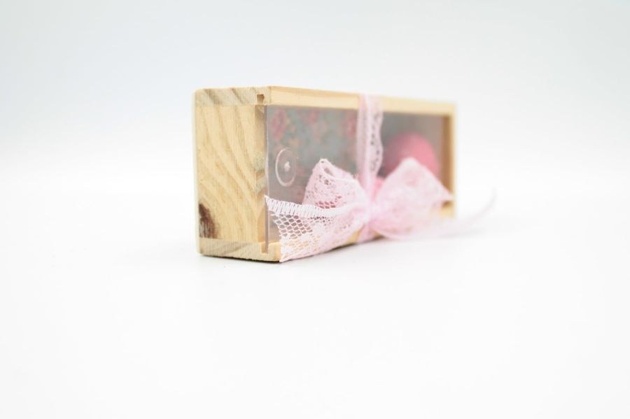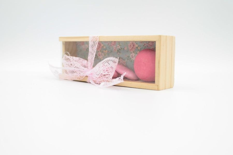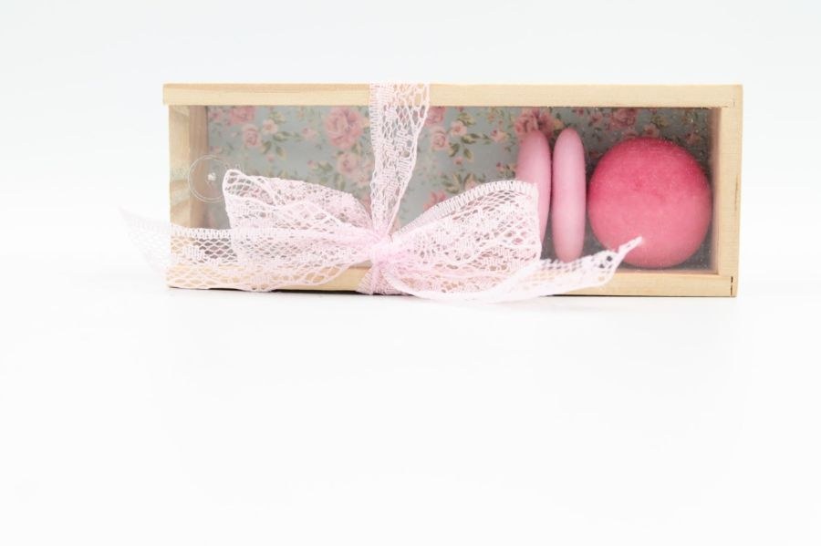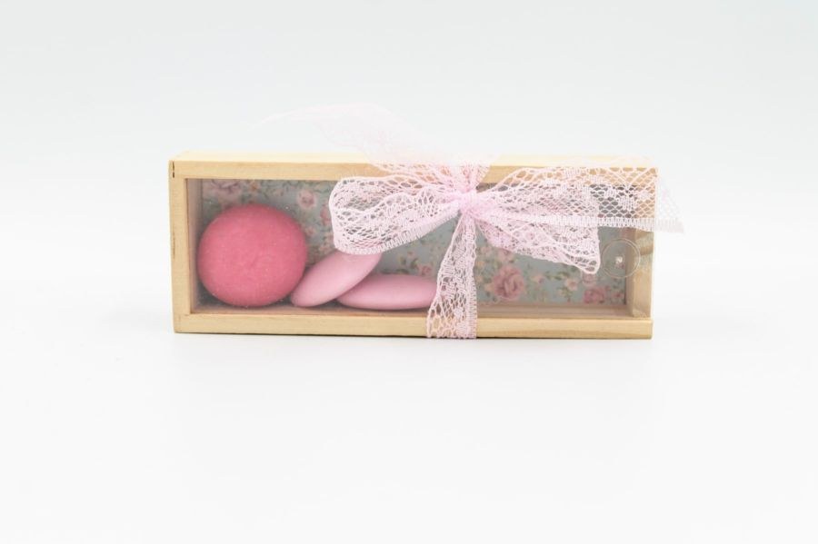 Μπομπονιέρα Βάπτισης ξύλινο κουτί με παράθυρο plexiglass, με εσωτερική φλοράλ εκτύπωση και κορδέλα δαντέλα.
