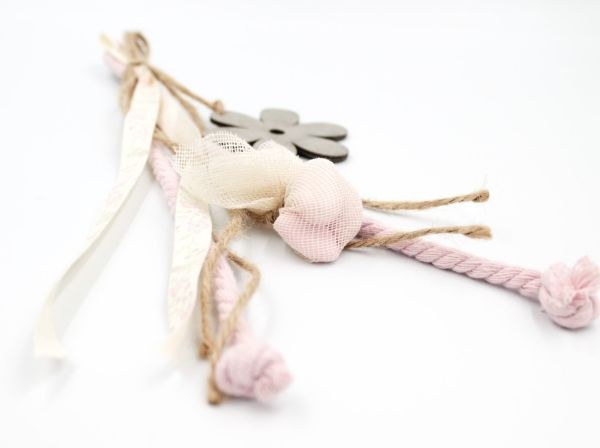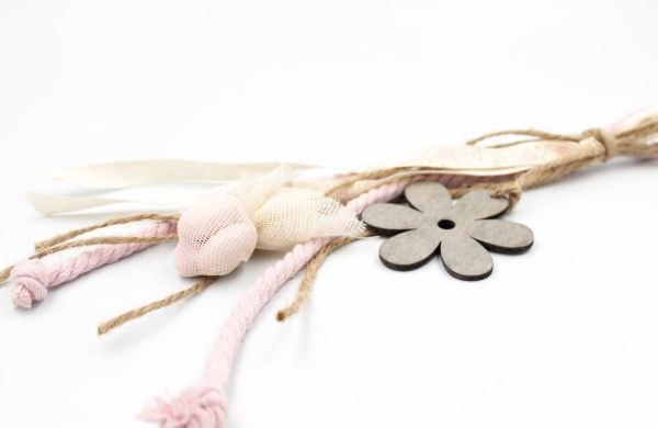 Κρεμαστή μπομπονιέρα σε ροζ αποχρώσεις και φλοράλ κορδέλα, με ξύλινο λουλουδάκι.